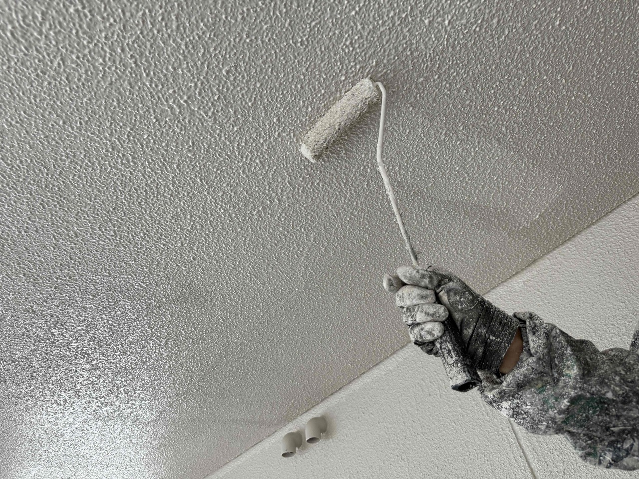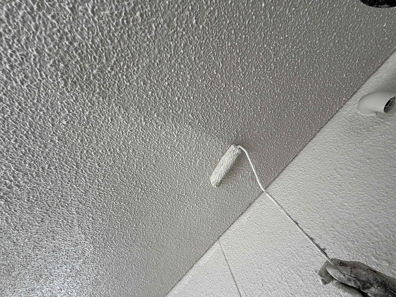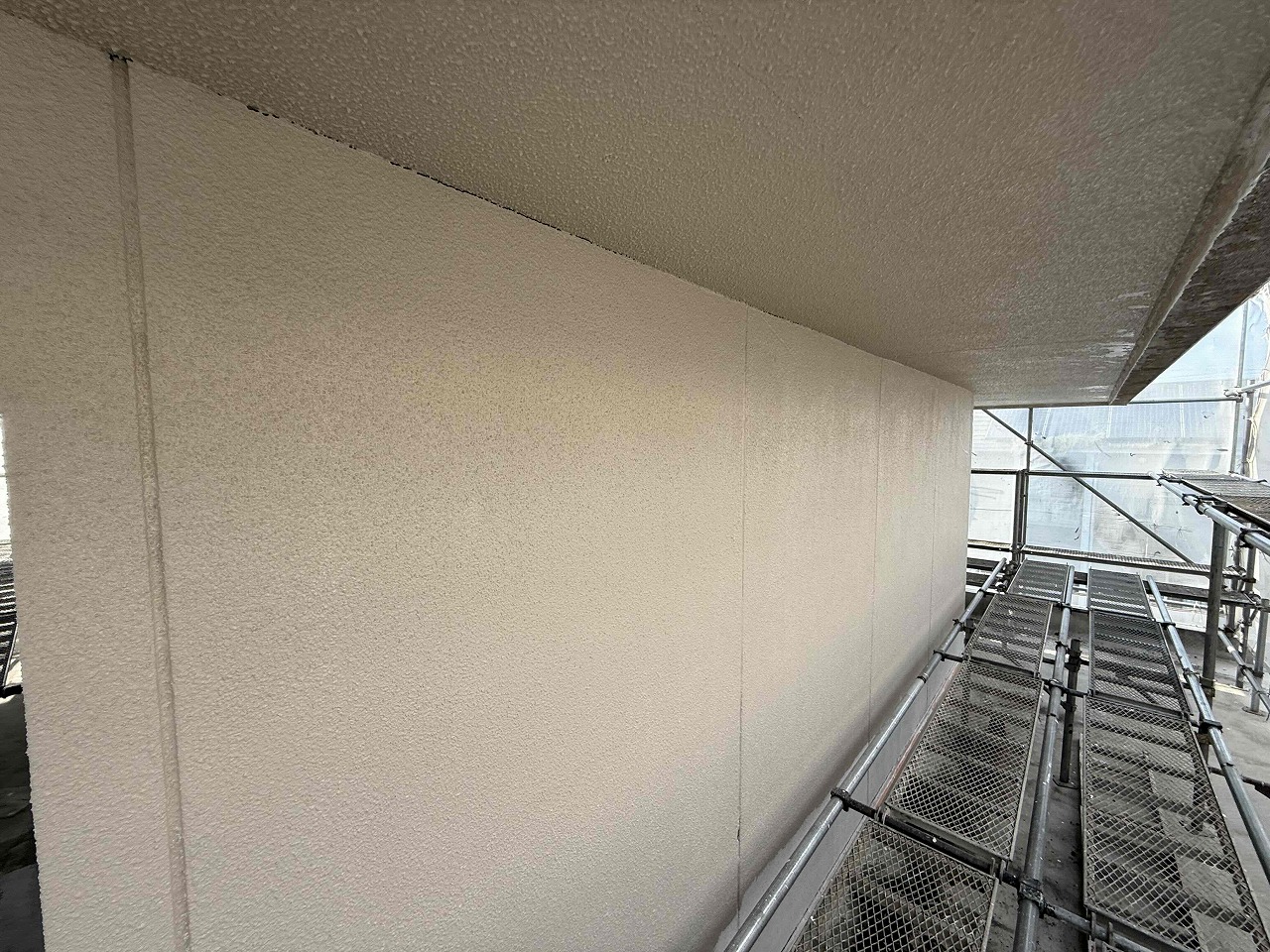 先日、中塗り(2回目塗装)が完了しており、本日は上塗り(3回目塗装)を行いました。こちらの建物は今後、2階部分の足場を解体し、1階部分の防水工事と外壁塗装が残っているため、引き続き行っていく予定となっております。
