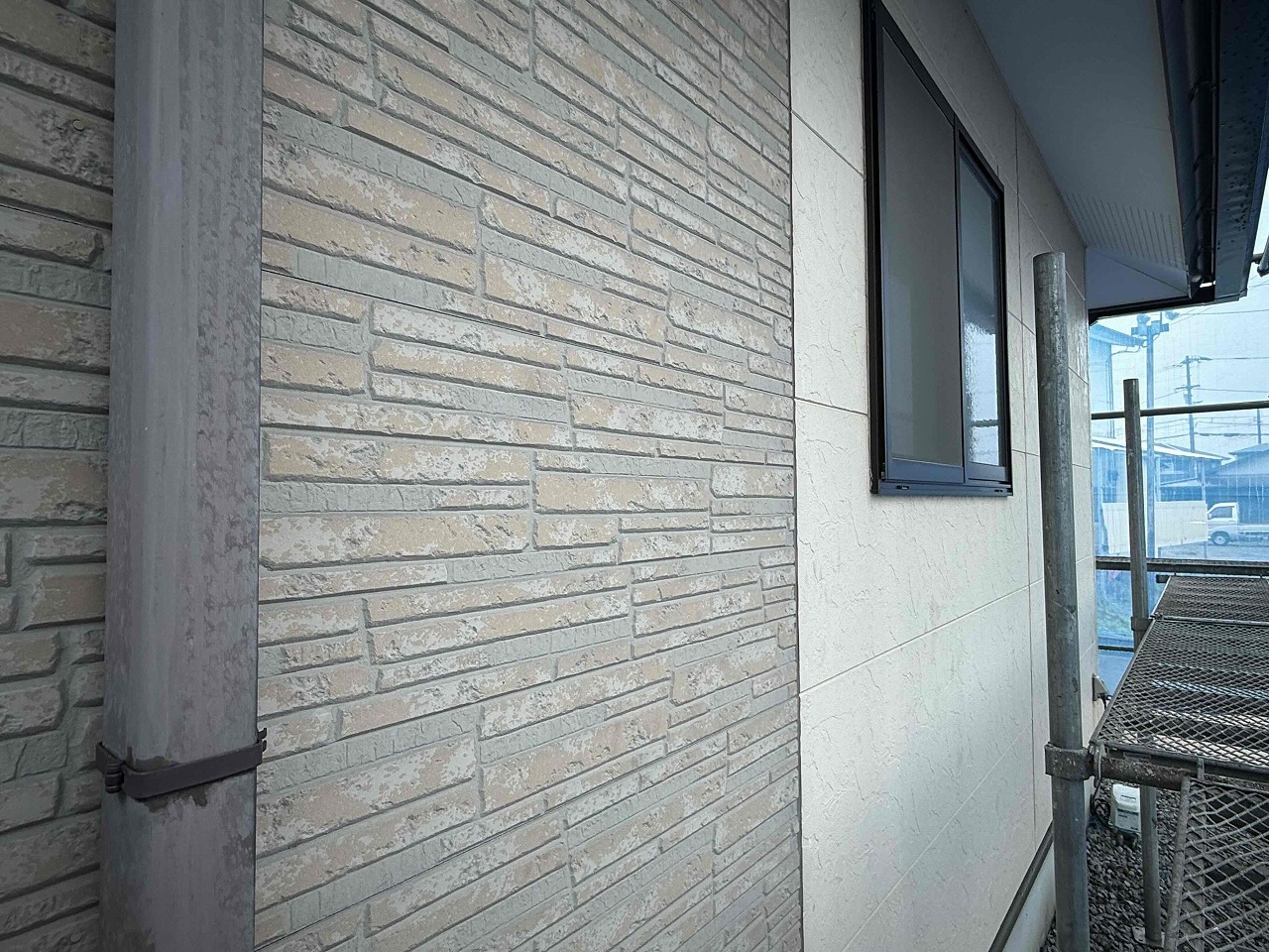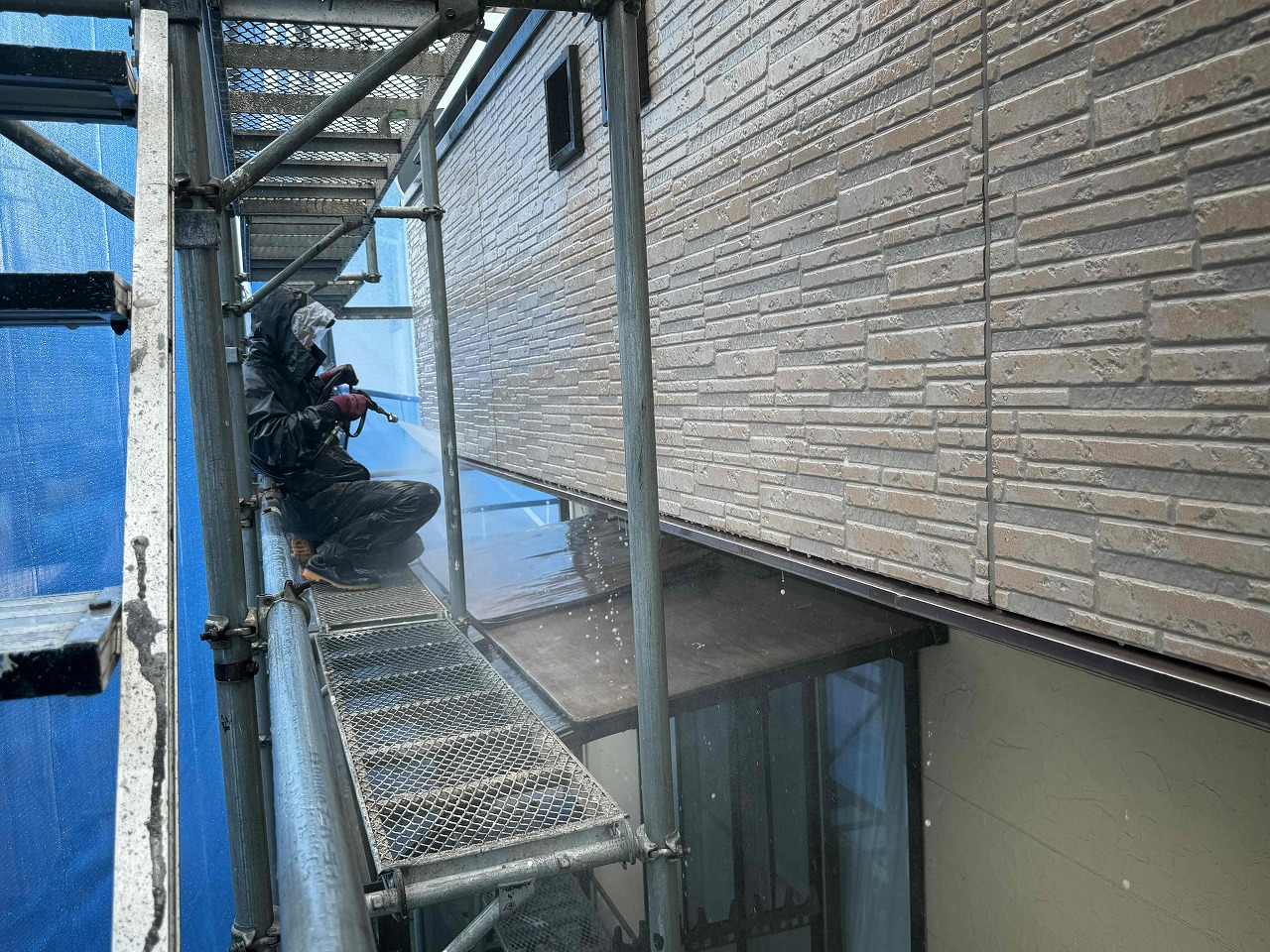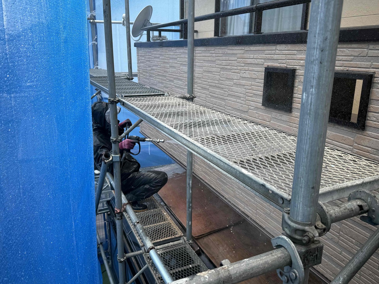 先日、足場の設置が完了した現場にて、本日、高圧洗浄を行いました!