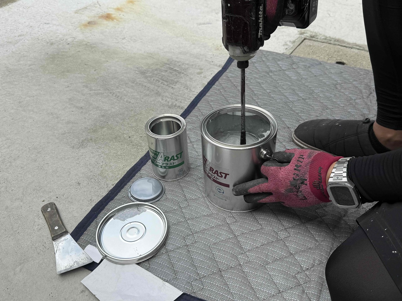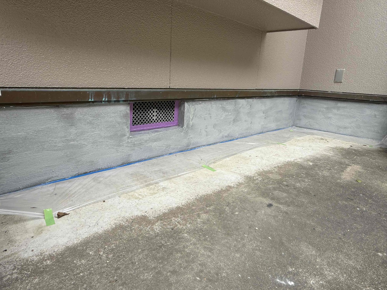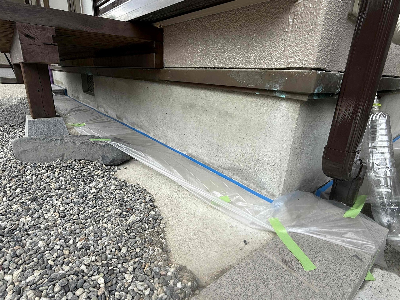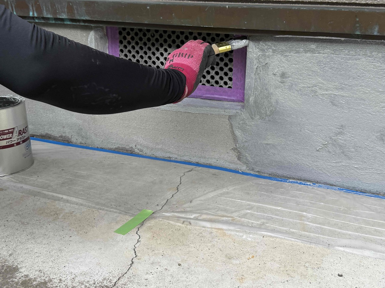 先日、外壁塗装が完了している現場にて、本日、基礎補強工事(パワーアラストFL)を行いました。まず、ケレン作業にて基礎についていた土や汚れを落とし、その後、パワーアラストFLでクラック部分の補修を含む塗装工事を行いました。