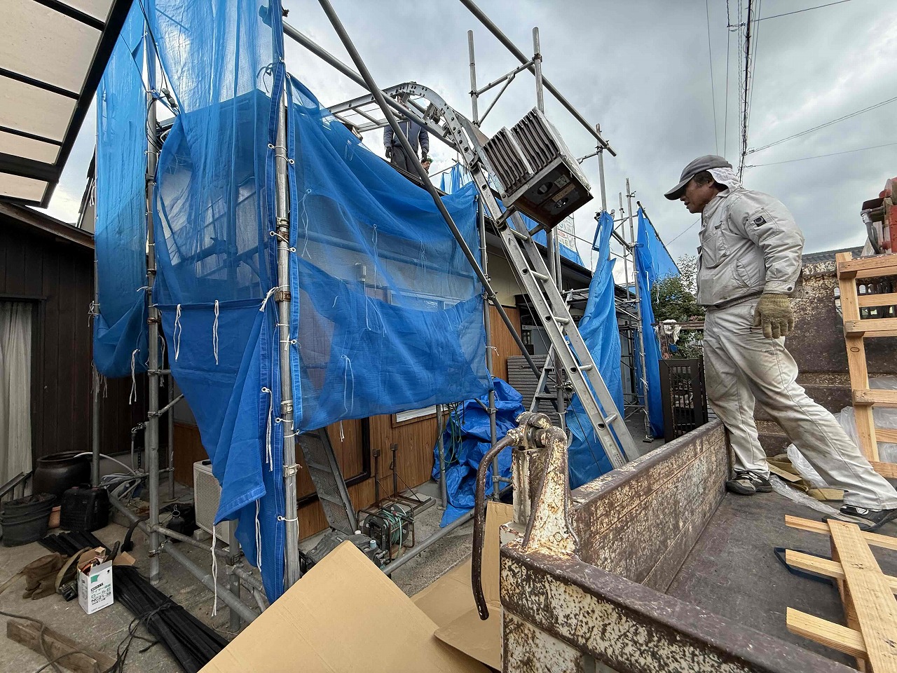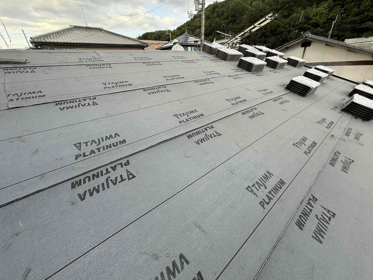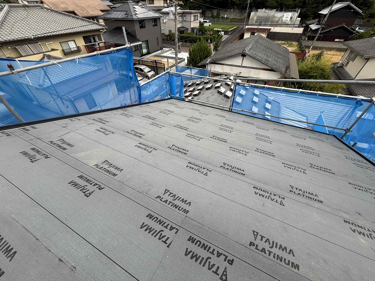 先日、既存瓦の撤去作業を行い、野地板とルーフィング(防水シート)の施工を行いました。明日より、ケイミューROOGA(鉄平)の施工を行っていく予定となっております。引き続きよろしくお願いいたします!?