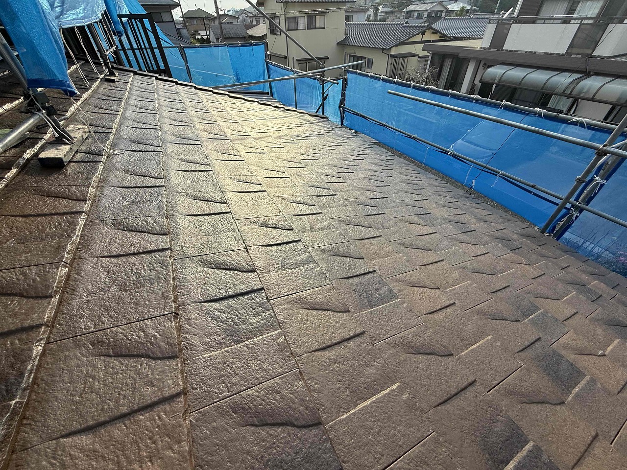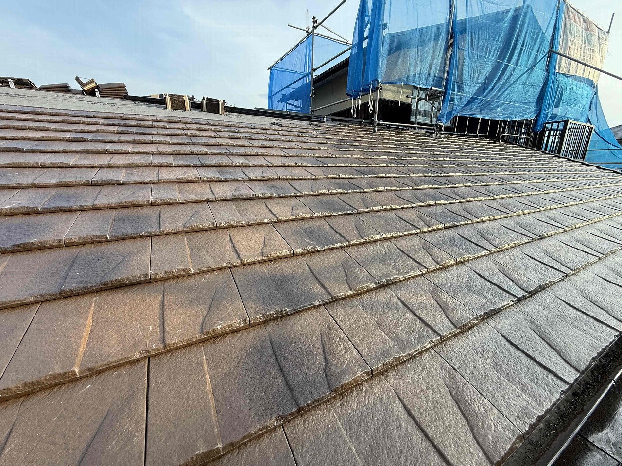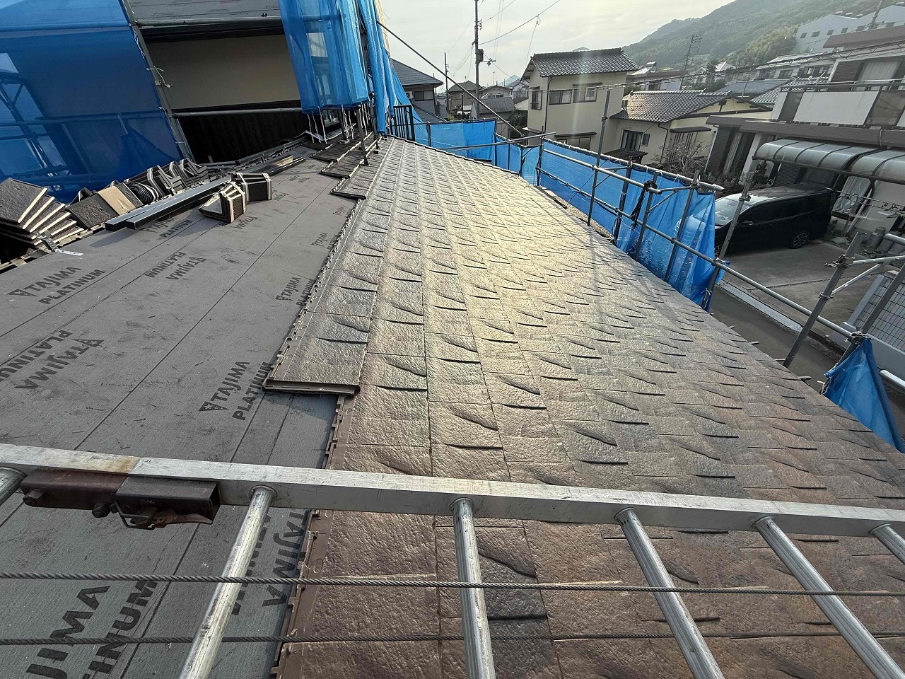 先日、野地板施工とルーフィング(防水シート)の施工が完了しており、本日ケイミューROOGA鉄平の施工を行いました。次回も続きを行っていく予定となっております。引き続きよろしくお願いいたします!?