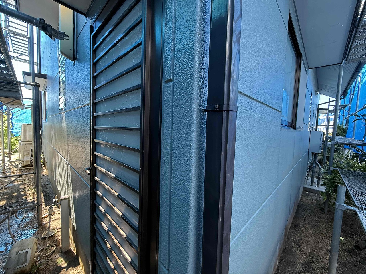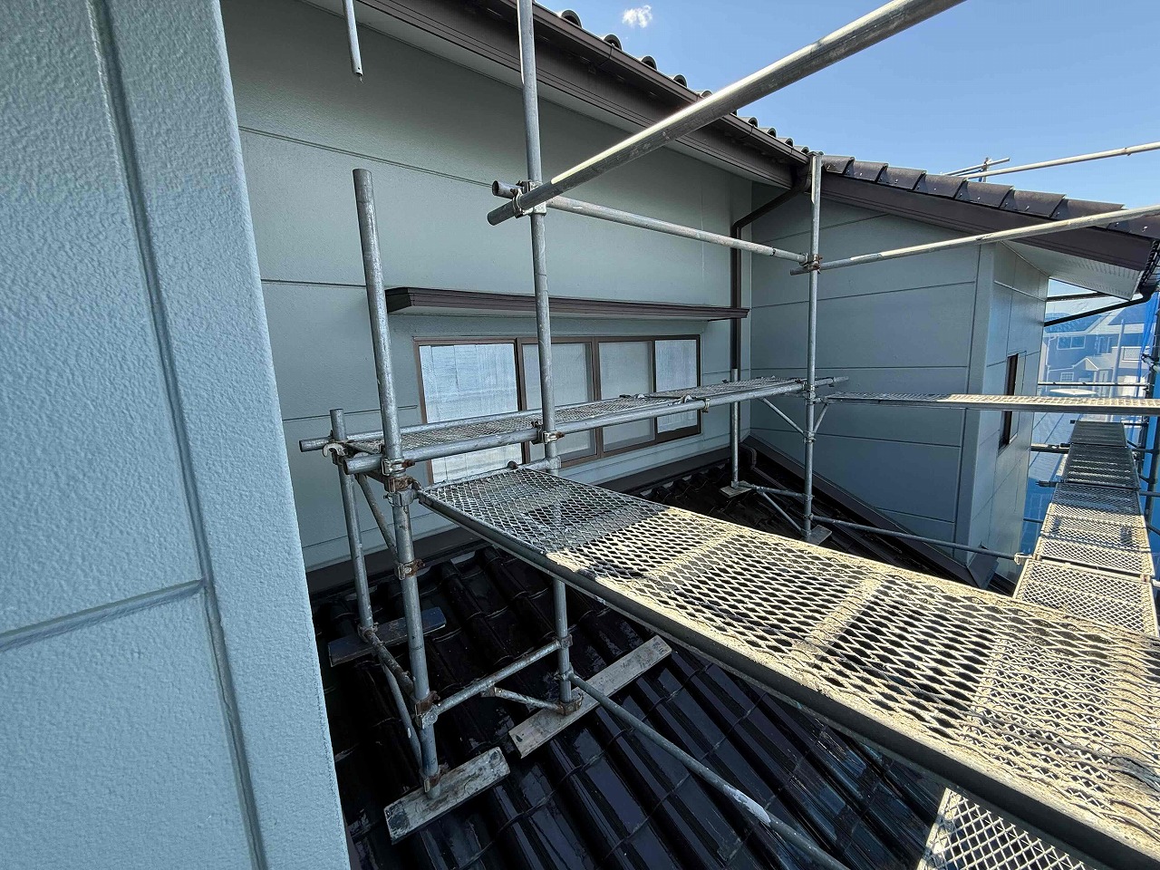 先日、足場の設置が完了しており、本日は高圧洗浄を行いました。明日は外壁の養生作業を行っていく予定となっております。引き続きよろしくお願いいたします!?
