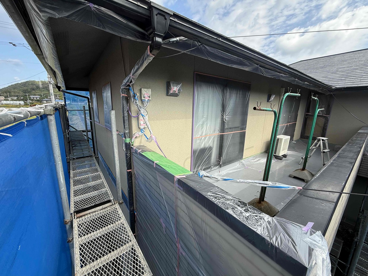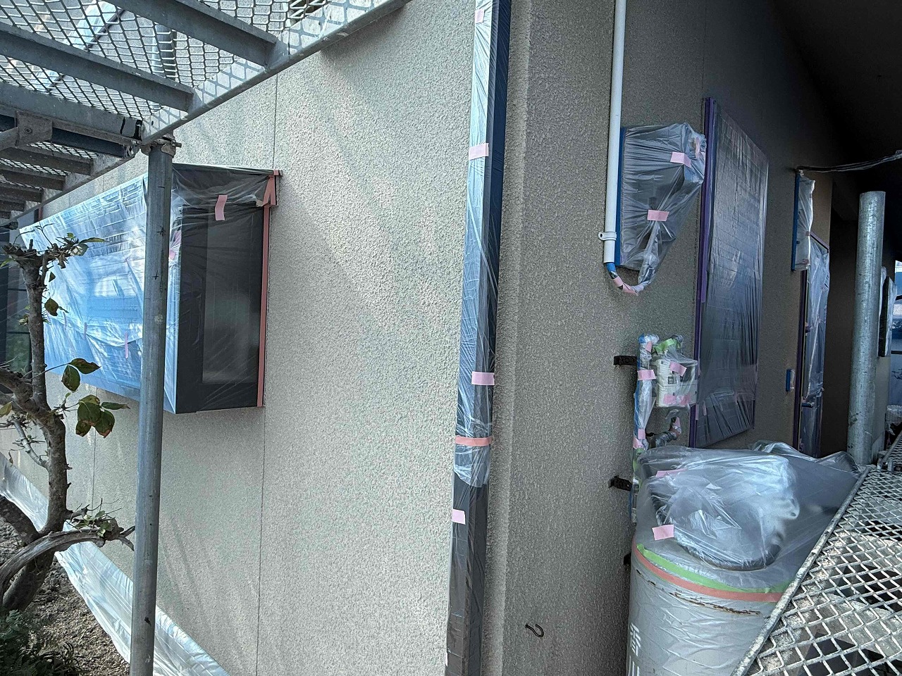 先日に引き続き、外壁の養生作業を行いました。次回、外壁塗装工事の下塗り(1回目塗装)を行っていく予定となっております。引き続きよろしくお願いいたします!?
