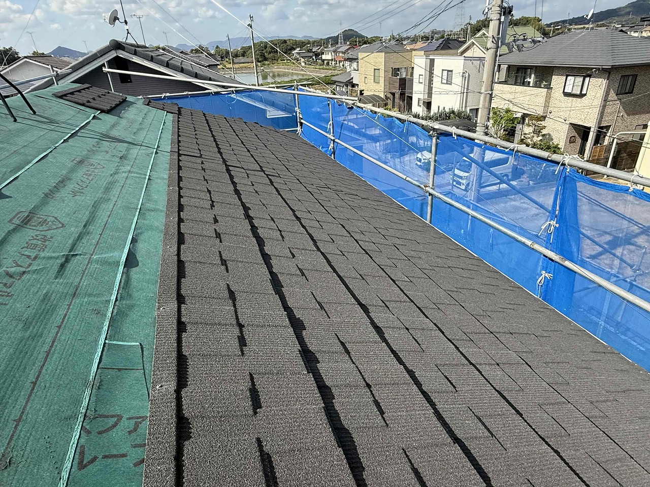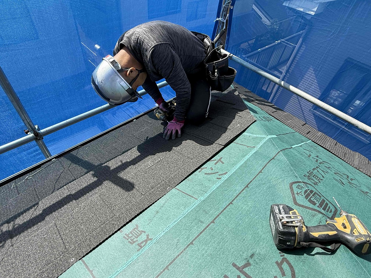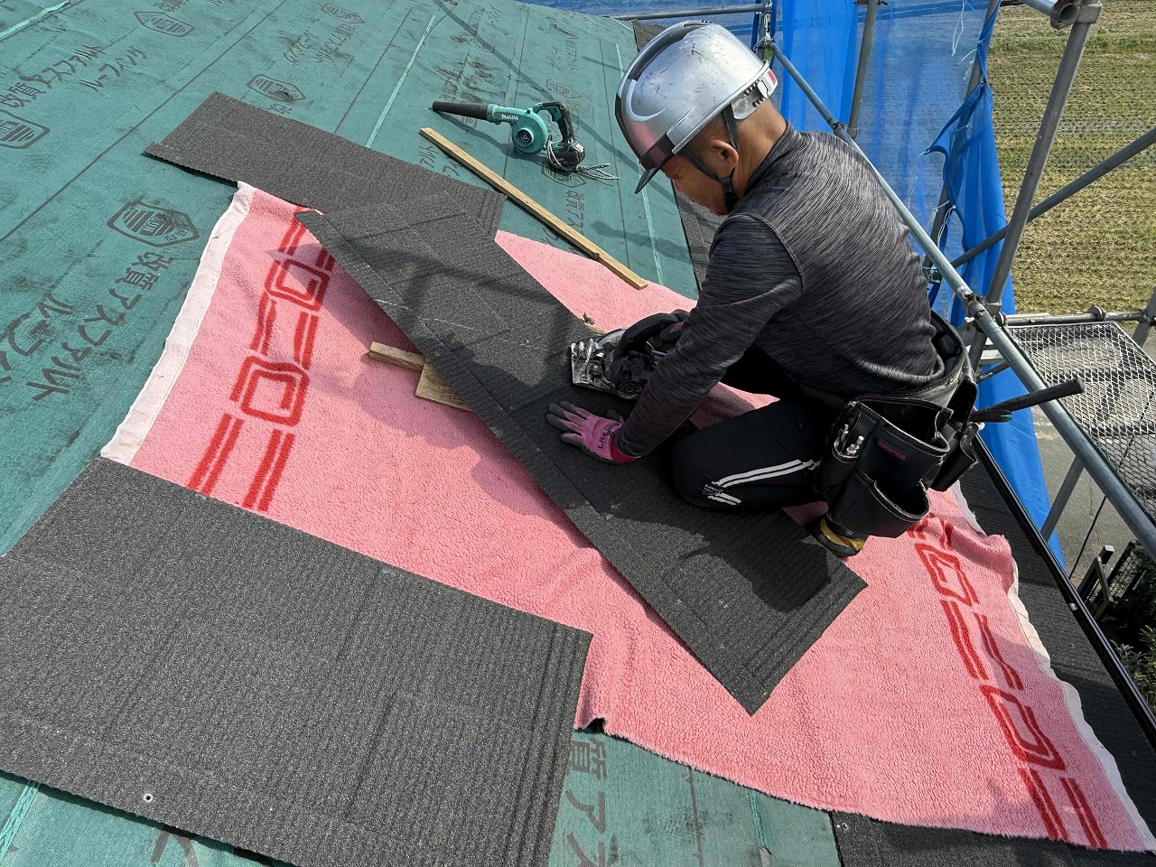 先日、ルーフィング(防水シート)の施工が完了しており、本日は屋根材の施工(カバー工法)を行いました。次回も続きを行っていく予定となっております。引き続きよろしくお願いいたします!?