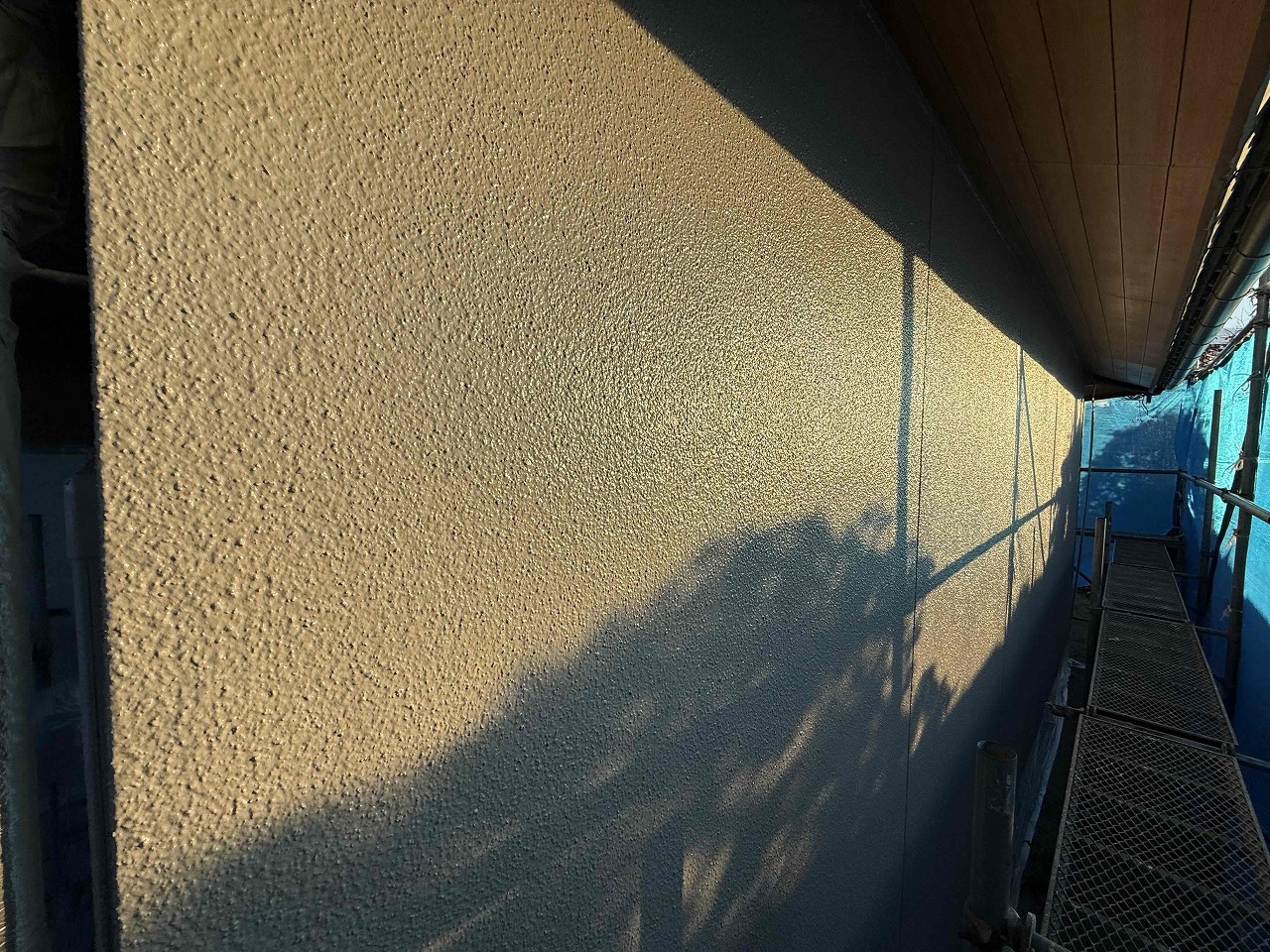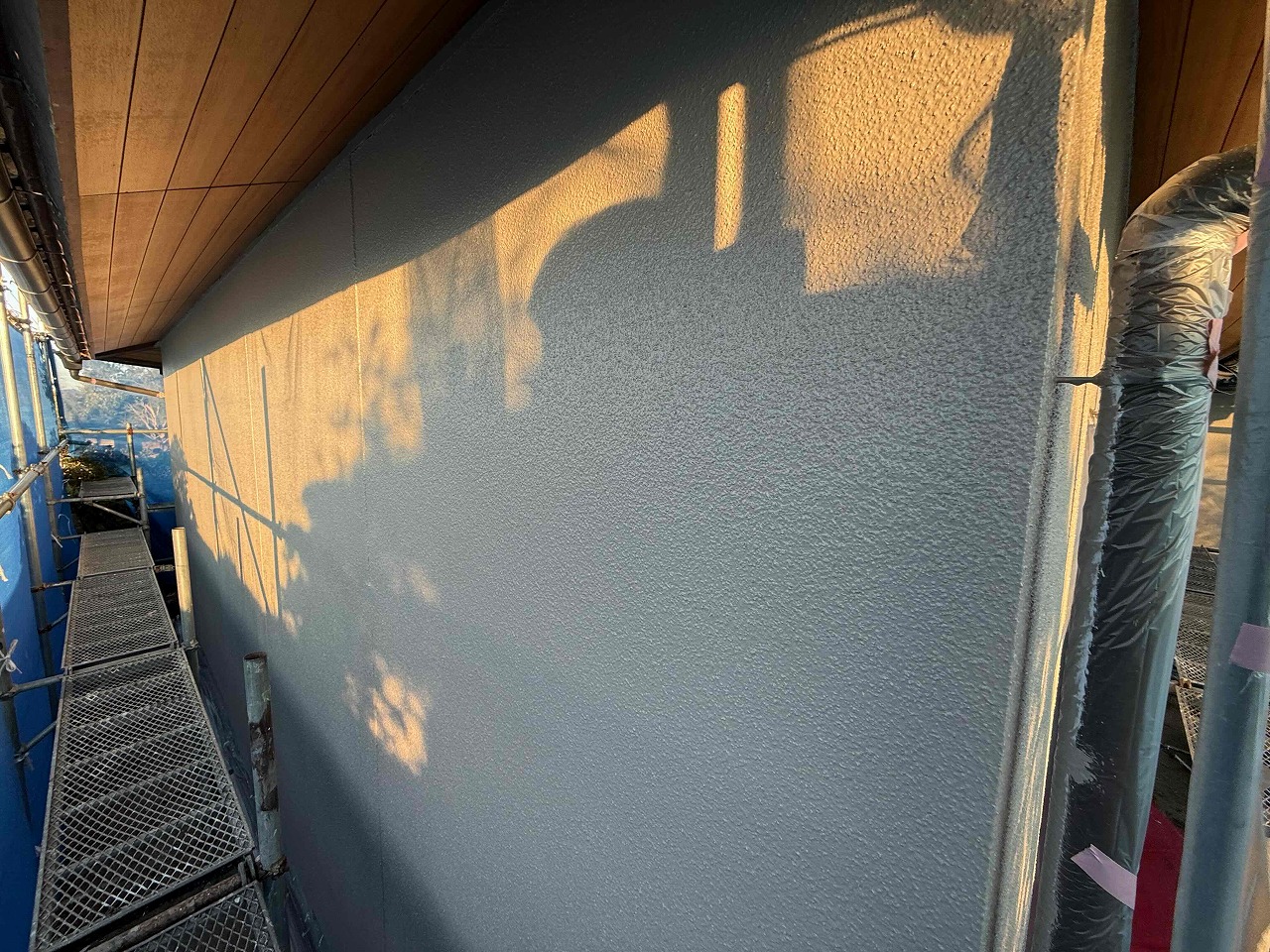 先日、外壁塗装の下塗り(1回目塗装)が完了しており、本日は中塗り(2回目塗装)を行いました。明日は上塗り(3回目塗装)を行っていく予定となっております。引き続きよろしくお願いいたします!?