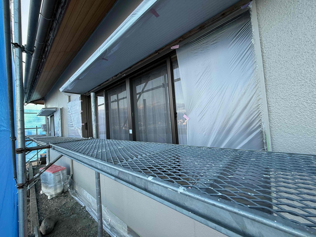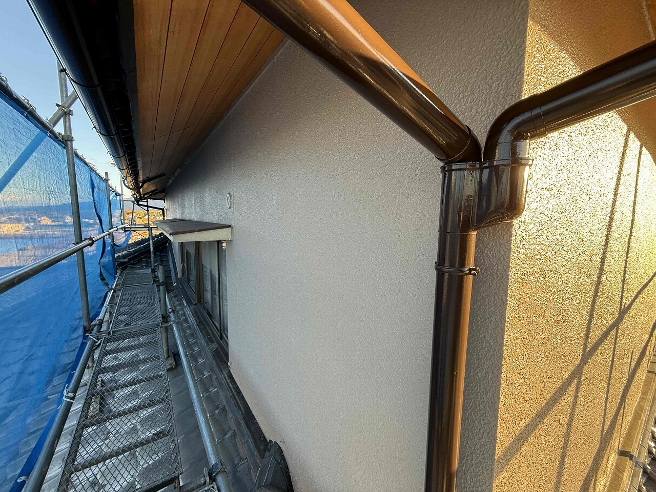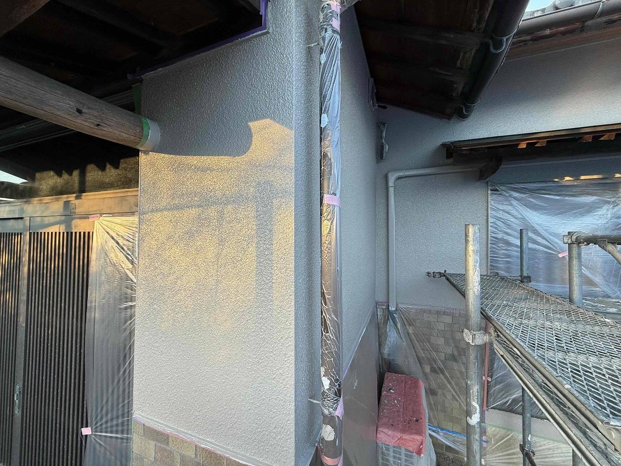 先日、外壁塗装の中塗り(2回目塗装)が完了しており、本日は上塗り(3回目塗装)を行いました。