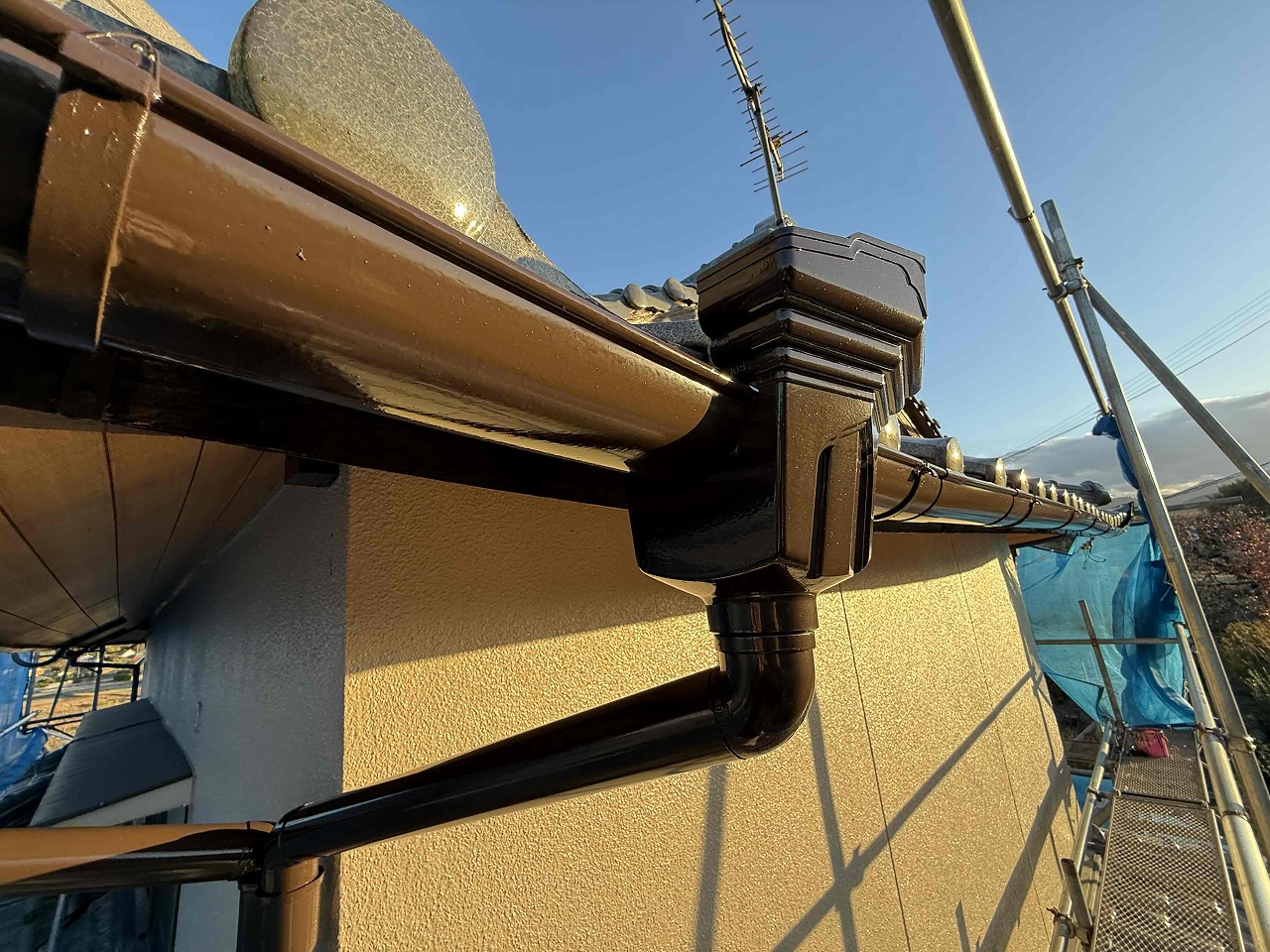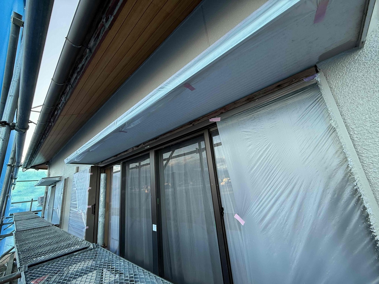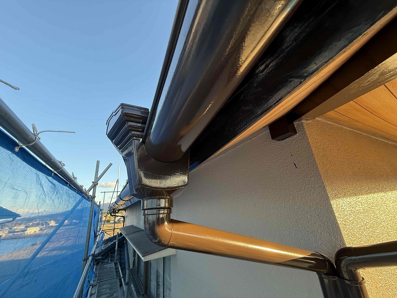 先日、外壁塗装の中塗り(2回目塗装)が完了しており、本日は上塗り(3回目塗装)を行いました。