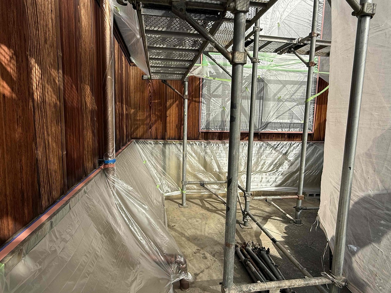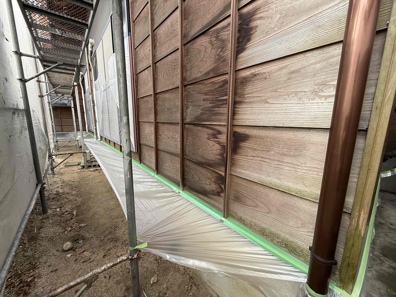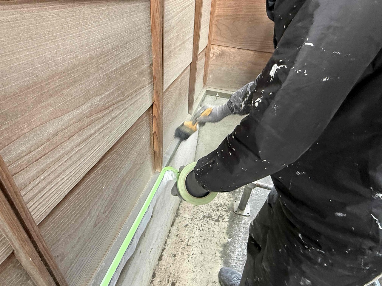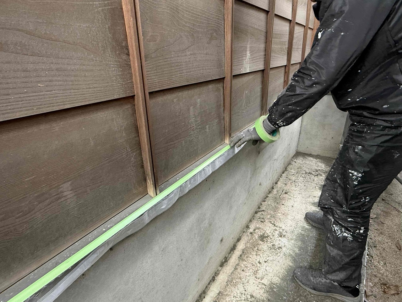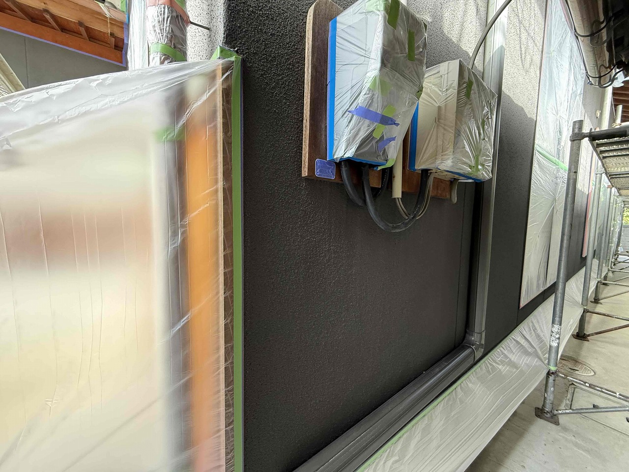 先日高圧洗浄が完了しており、本日は外壁塗装工事前の養生作業を行いました!