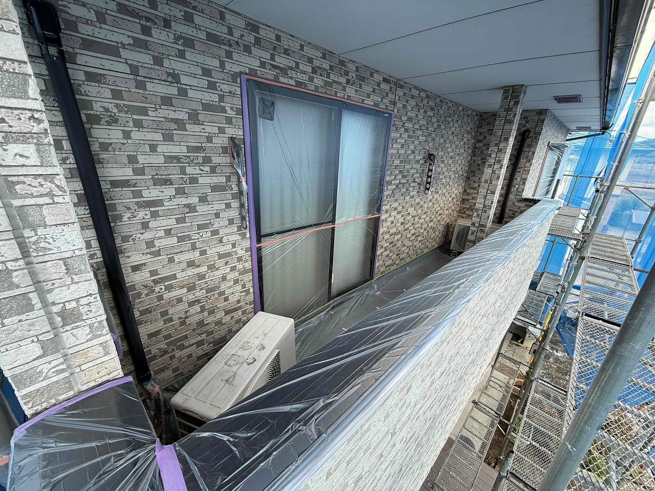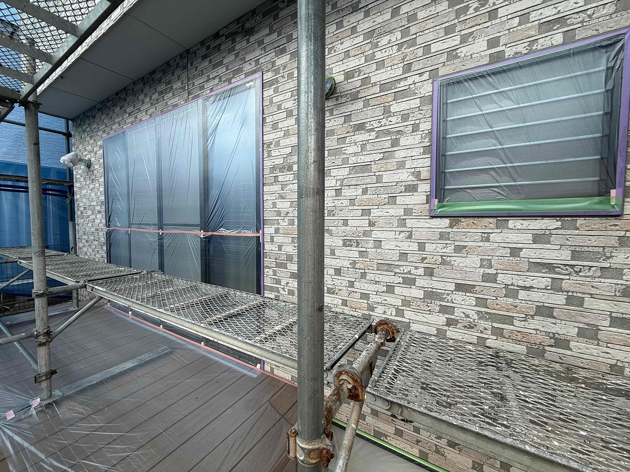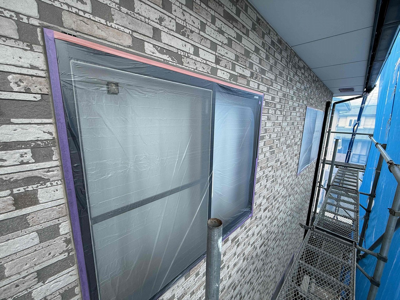先日、高圧洗浄が完了しており、本日は養生作業を行いました。