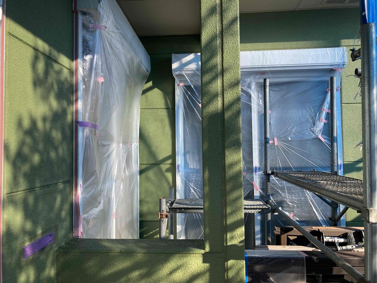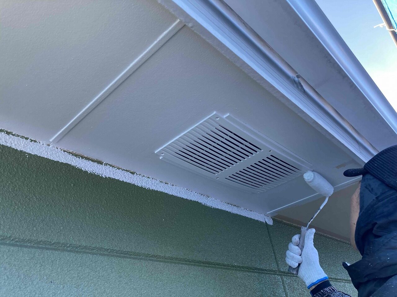 先日、養生作業が完了しており、本日は外壁塗装の下塗り(1回目塗装)を行ったのち、軒天塗装(日本ペイントケンエース)を行いました。明日、中塗り(2回目塗装)を行っていく予定となっております。引き続きよろしくお願いいたします!?
