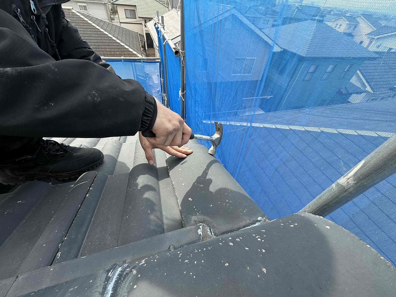 その後、袖瓦を止めている釘に多数の浮きがあるため、ハンマーにて調整させていただき、後日、瓦を固定する工事をする予定となっております!