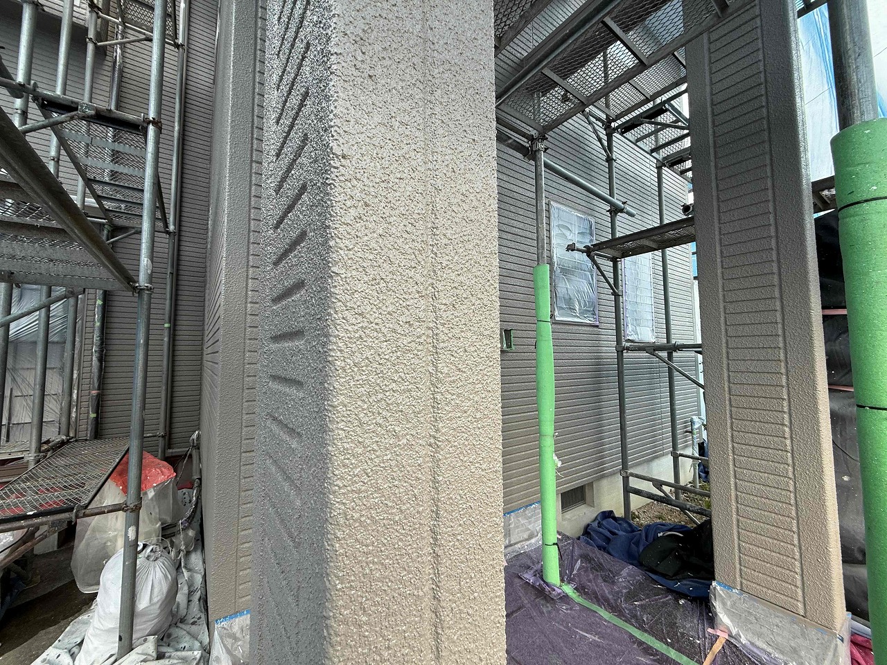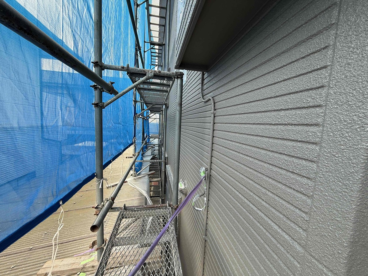 先日、外壁塗装の中塗り(2回目塗装)が完了しており、本日は外壁塗装の上塗り(3回目塗装)を行いました。次回、付帯パーツ類の塗装を行っていく予定となっております。引き続きよろしくお願いいたします!?