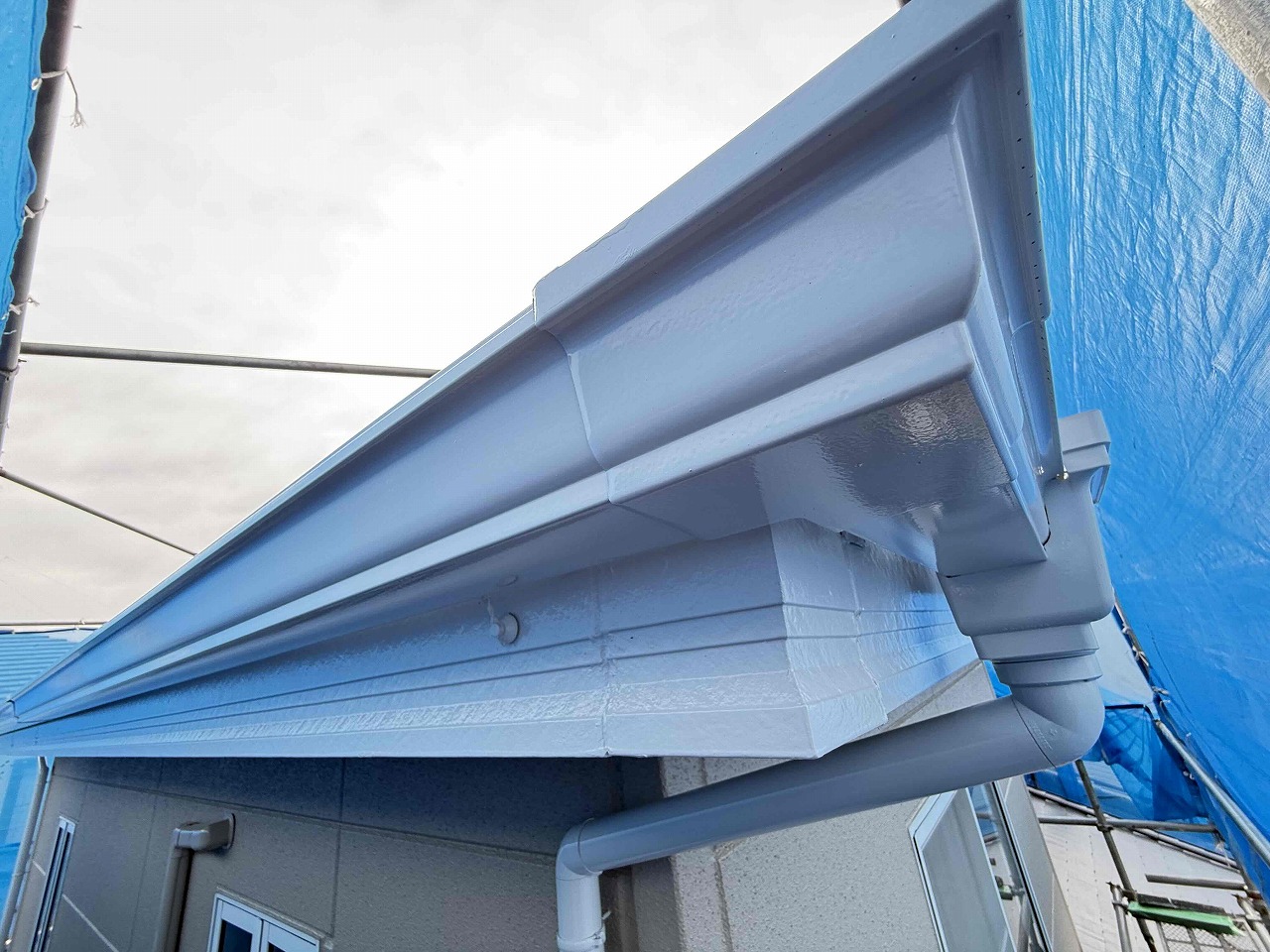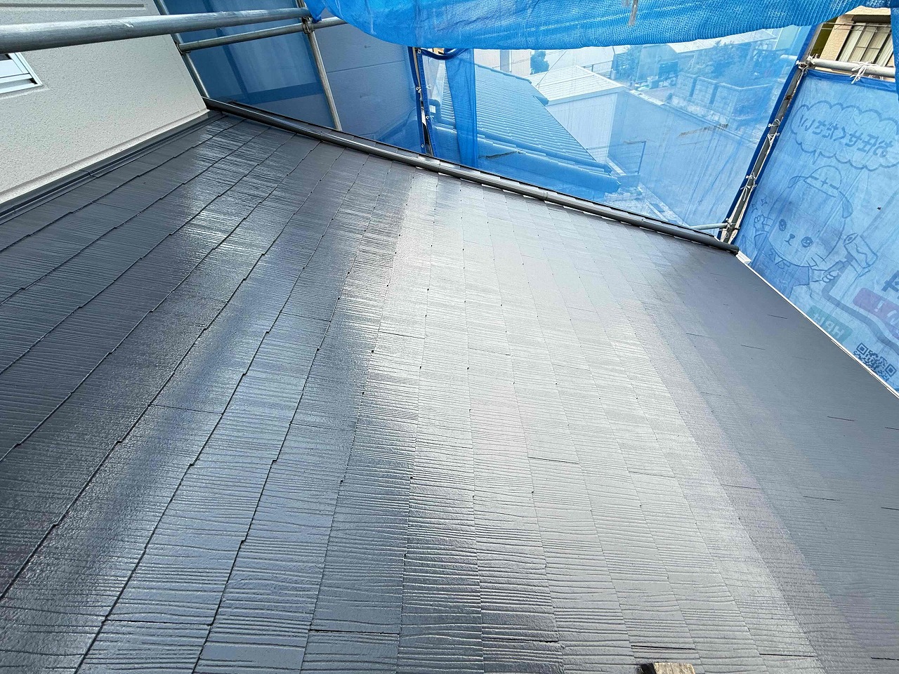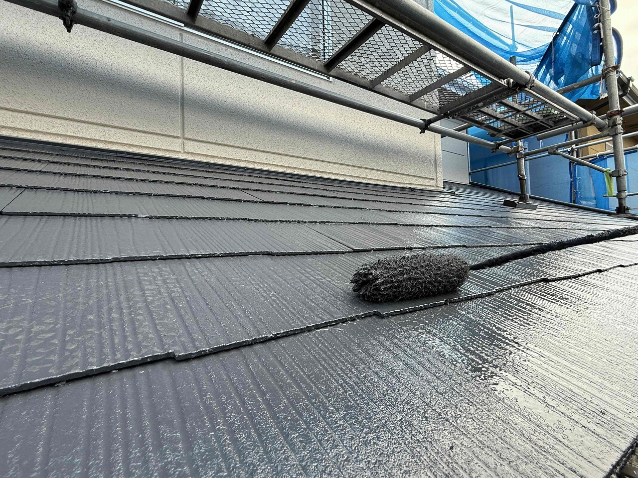 先日に引き続き、1階部分の屋根塗装を行い、完了し、2F部分の屋根塗装の最終チェックと手直しを行ったのち、雨樋塗装の続きを行いました。明日、基礎塗装工事を行い、全ての塗装工事が完了する予定となっております。引き続きよろしくお願いいたします!?