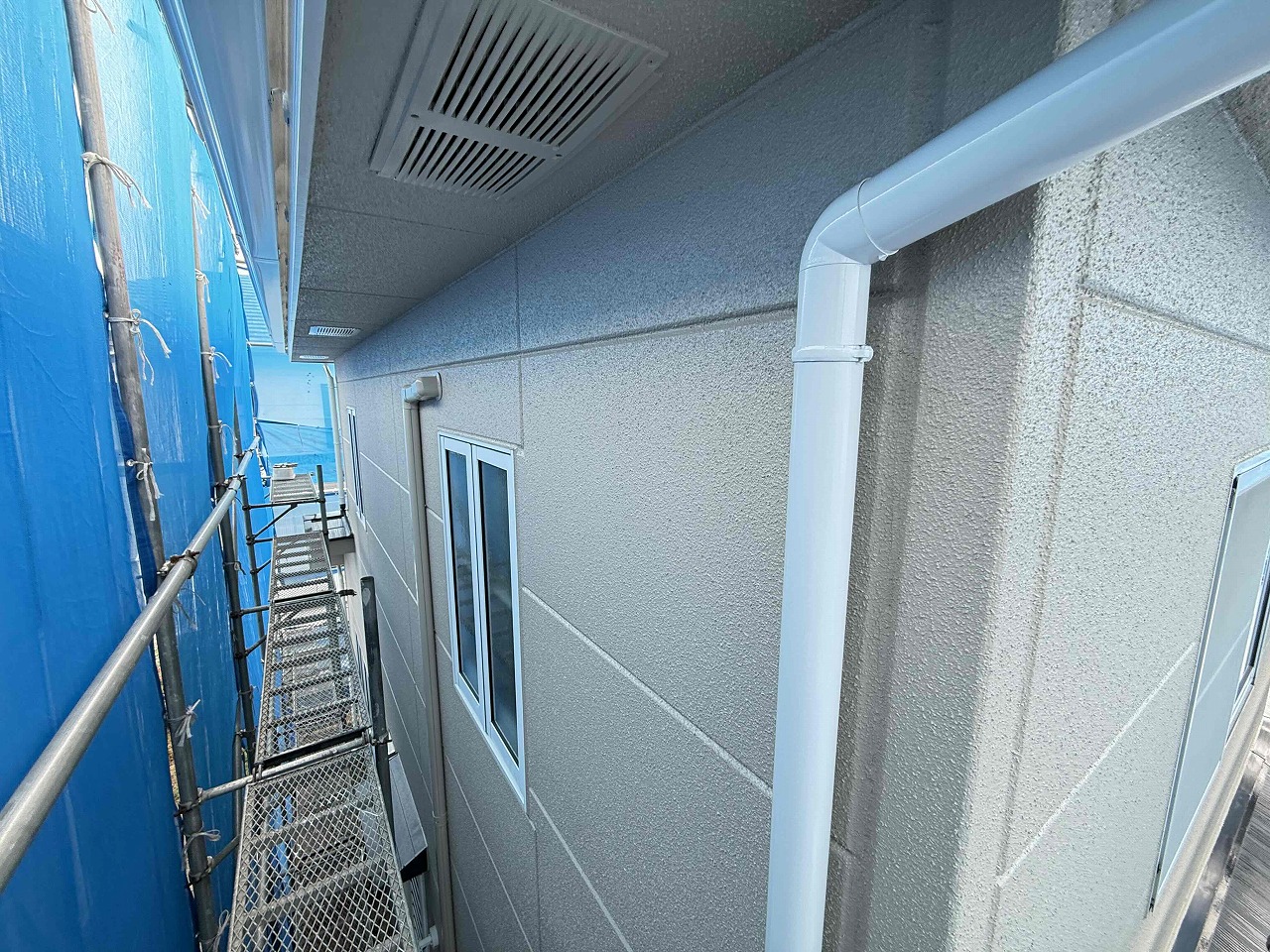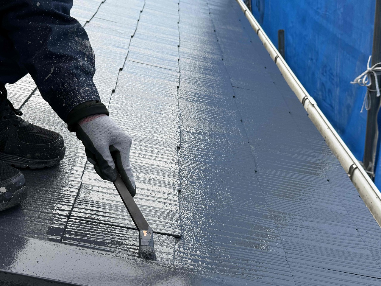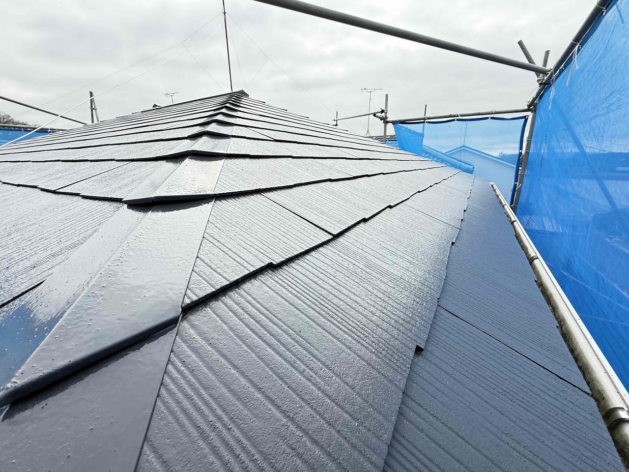 先日に引き続き、1階部分の屋根塗装を行い、完了し、2F部分の屋根塗装の最終チェックと手直しを行ったのち、雨樋塗装の続きを行いました。明日、基礎塗装工事を行い、全ての塗装工事が完了する予定となっております。引き続きよろしくお願いいたします!?