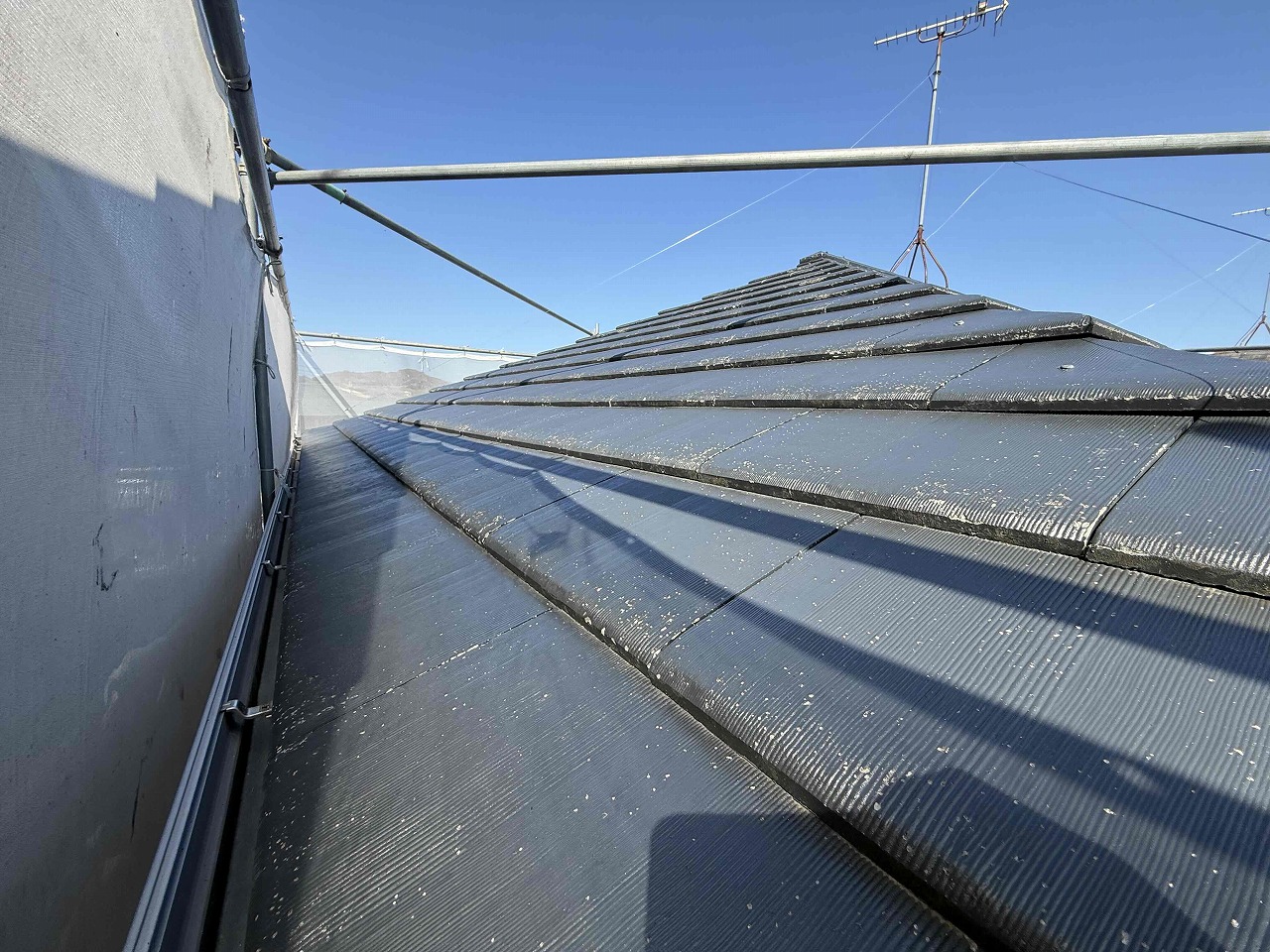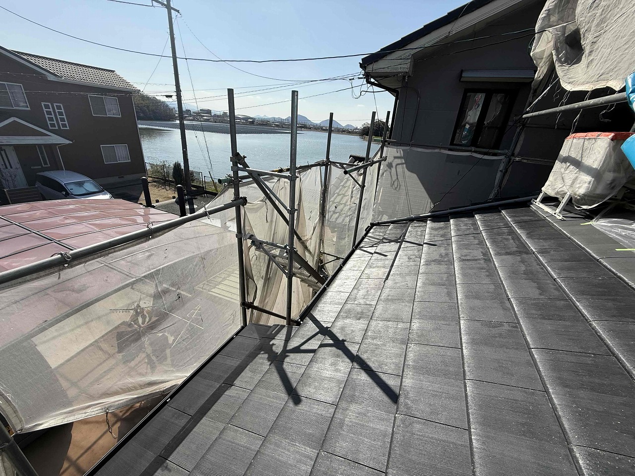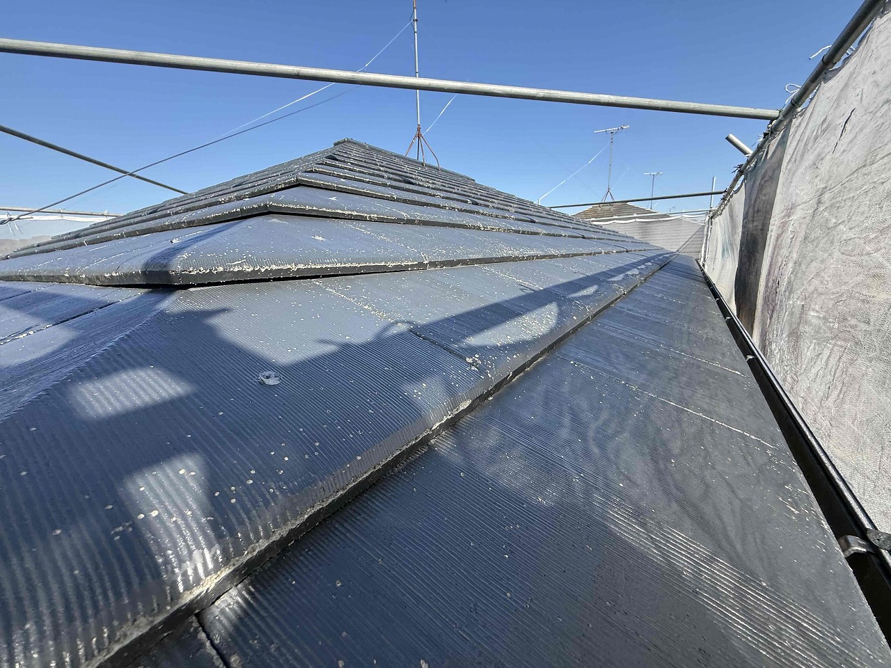 先日、外壁塗装工事の下塗り(1回目塗装)が完了しており、本日は外壁塗装工事の中塗り(2回目塗装)と屋根塗装工事の下塗り(1回目塗装)を行いました。