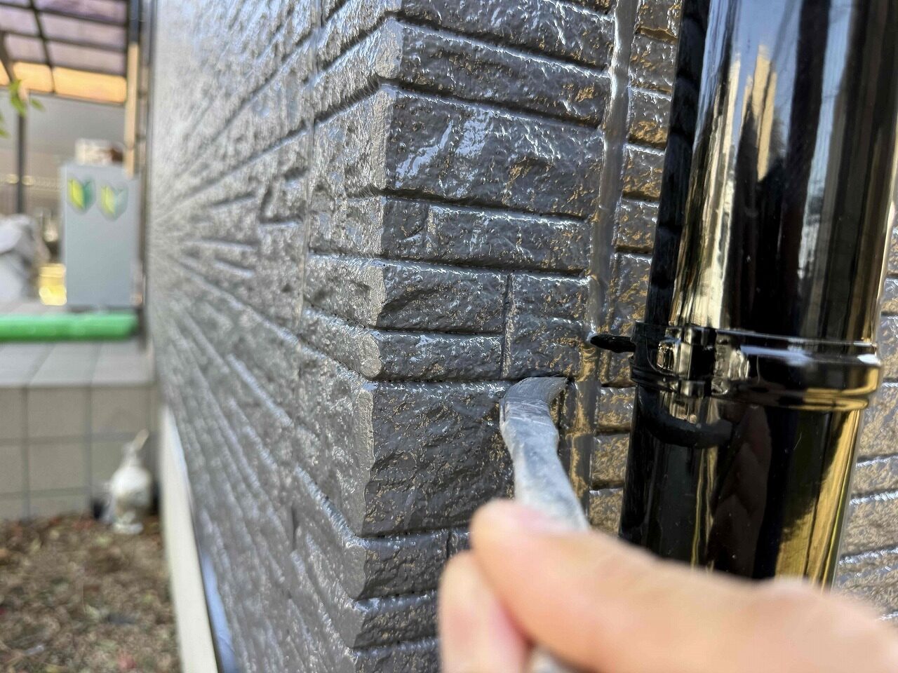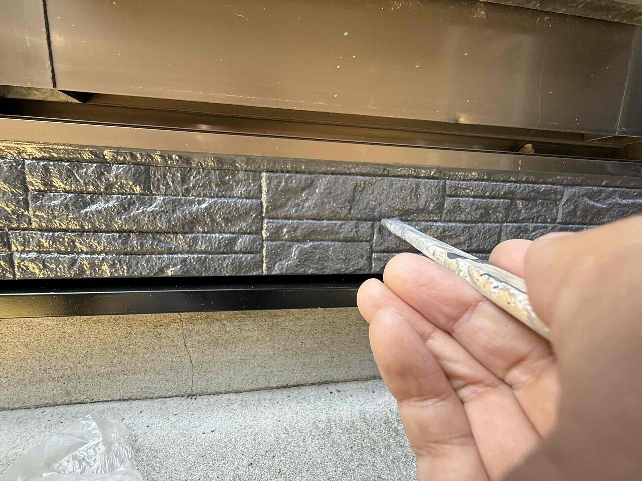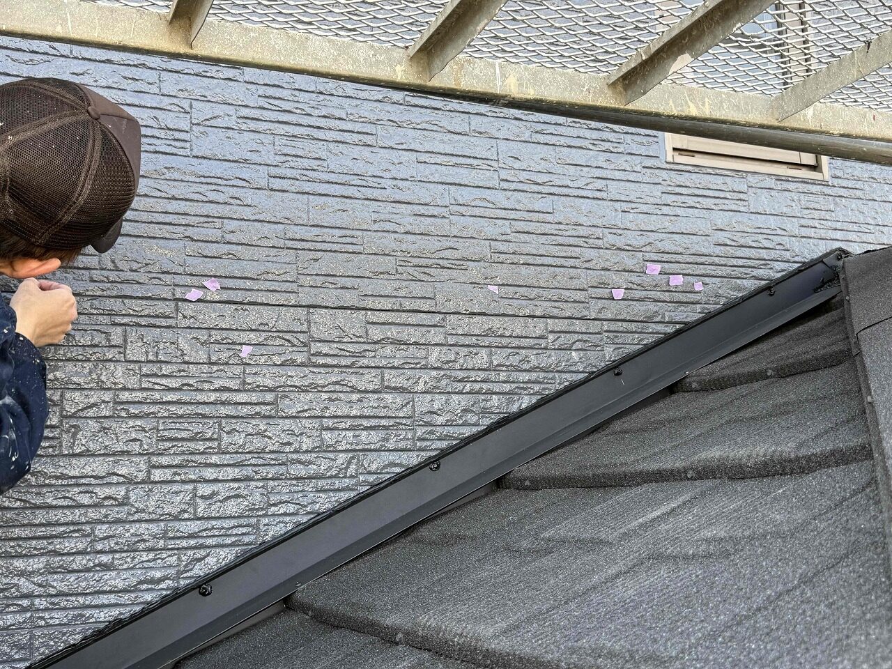 本日、足場を解体する前に、お客様から指摘のあった場所のタッチアップ塗装を、職人と自分を含めた4人で最終チェックと手直しを行いました。