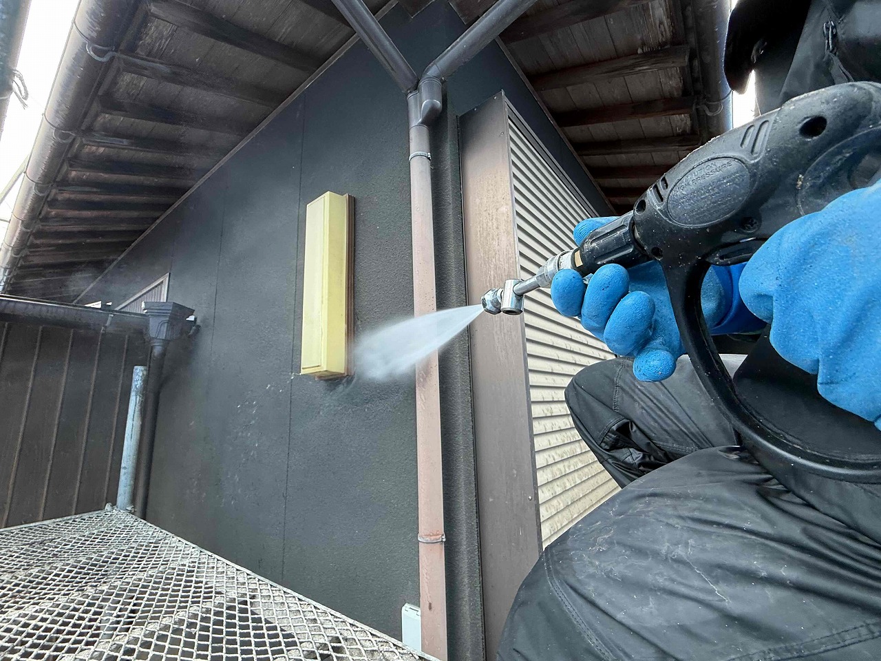 先日、足場の設置が完了しており、本日は高圧洗浄を行いました。次回、養生作業を行っていく予定となっております。引き続きよろしくお願いいたします!😄