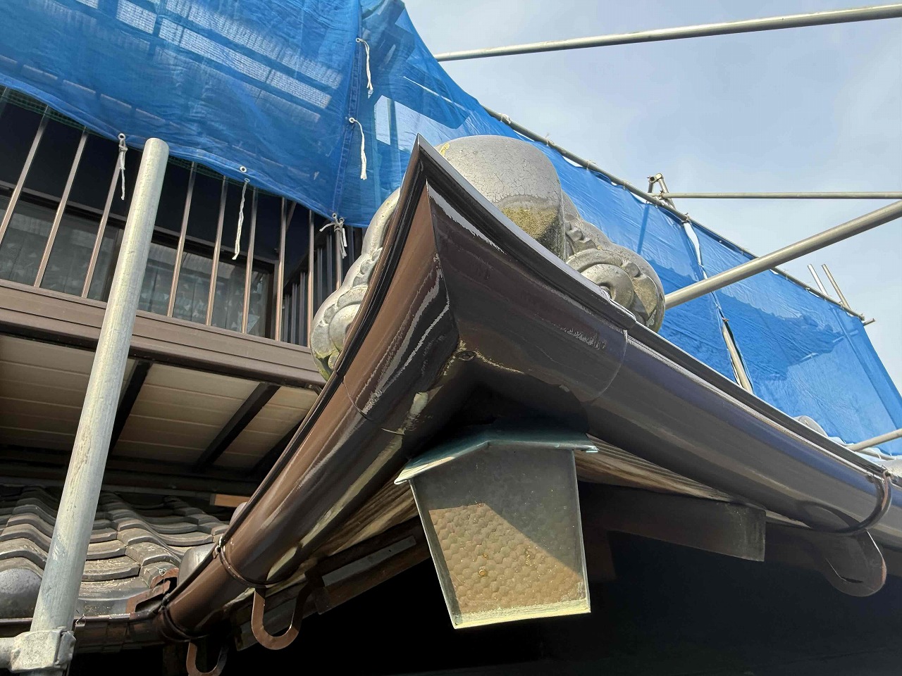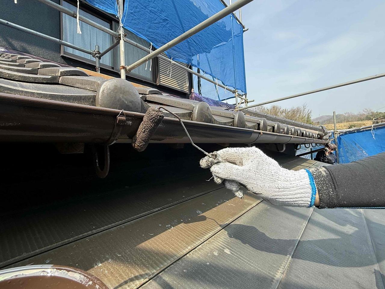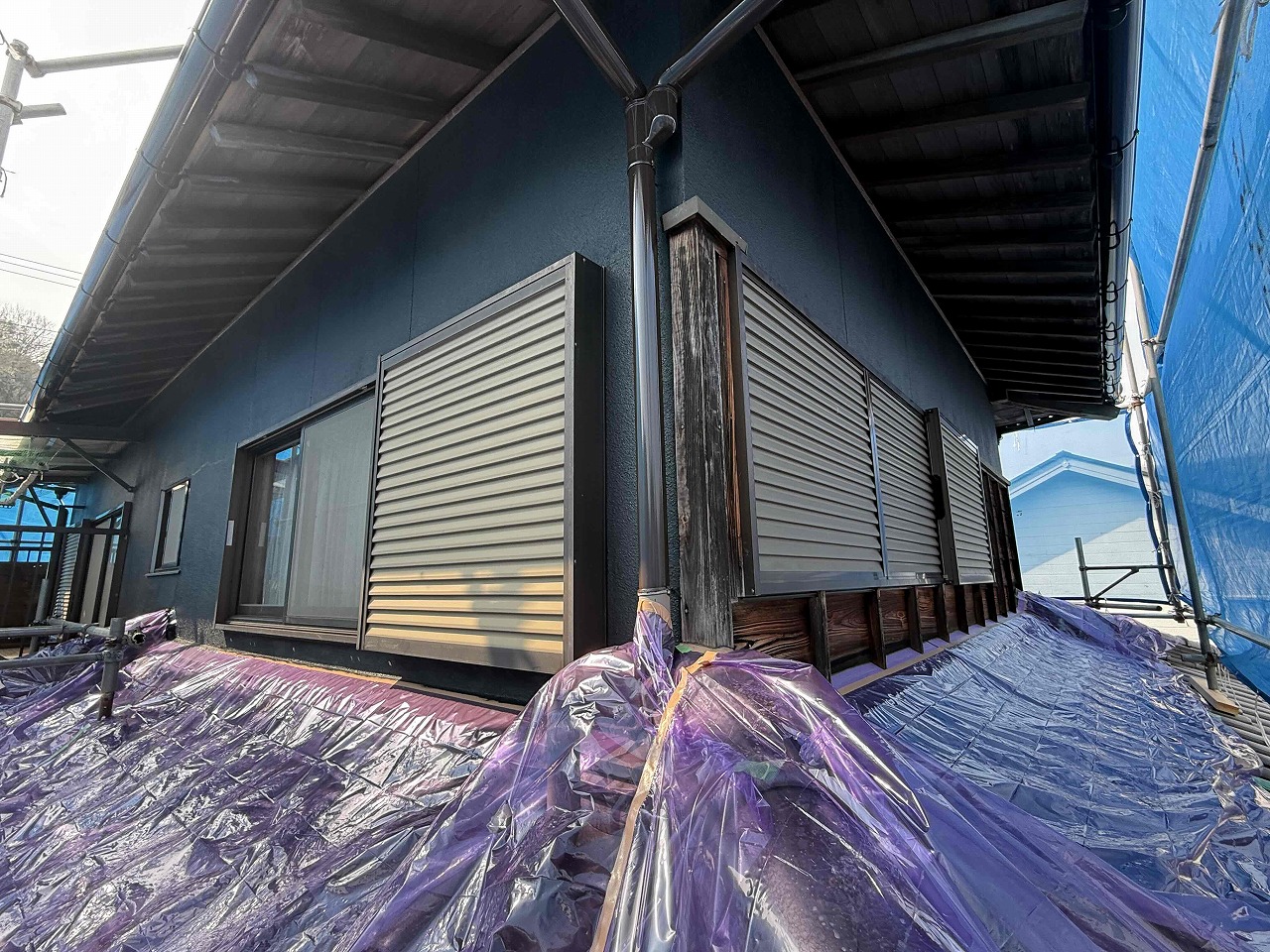 先日、外壁塗装の中塗り(2回目塗装)が完了しており、本日は上塗り(3回目塗装)を行ったのち、雨樋の塗装を行いました。次回、戸袋・雨戸・木部類の塗装を行っていく予定となっております。引き続きよろしくお願いいたします!😄