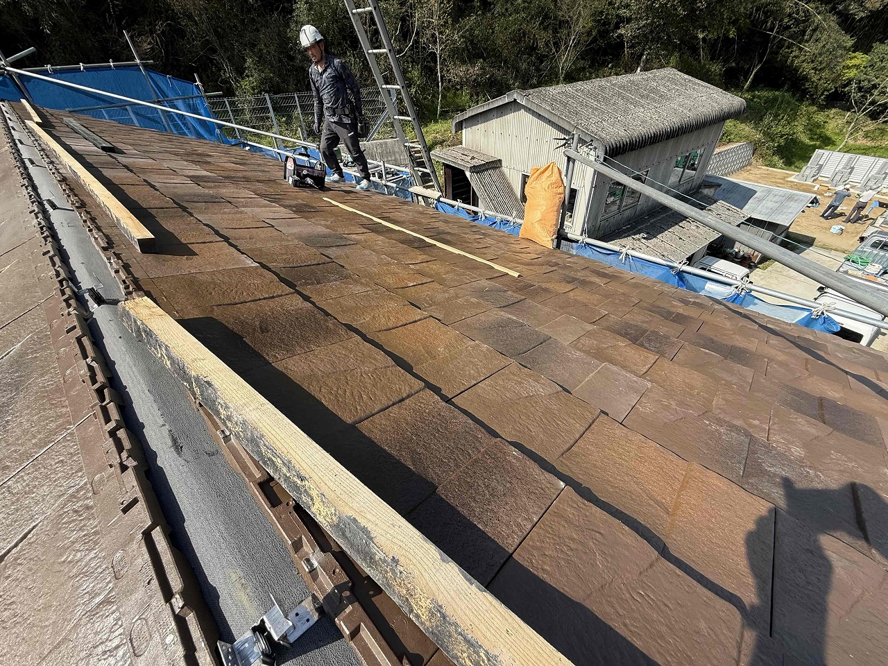 本日は2F部分のケイミューROOGA鉄平の施工を行いました。明日は天気予報が雨のため、現場はお休みし、次回、1F部分のケイミューROOGA鉄平の施工を行っていく予定となっております。引き続きよろしくお願いいたします!😄