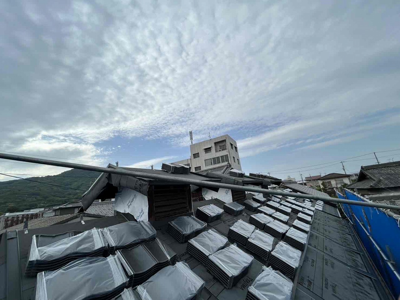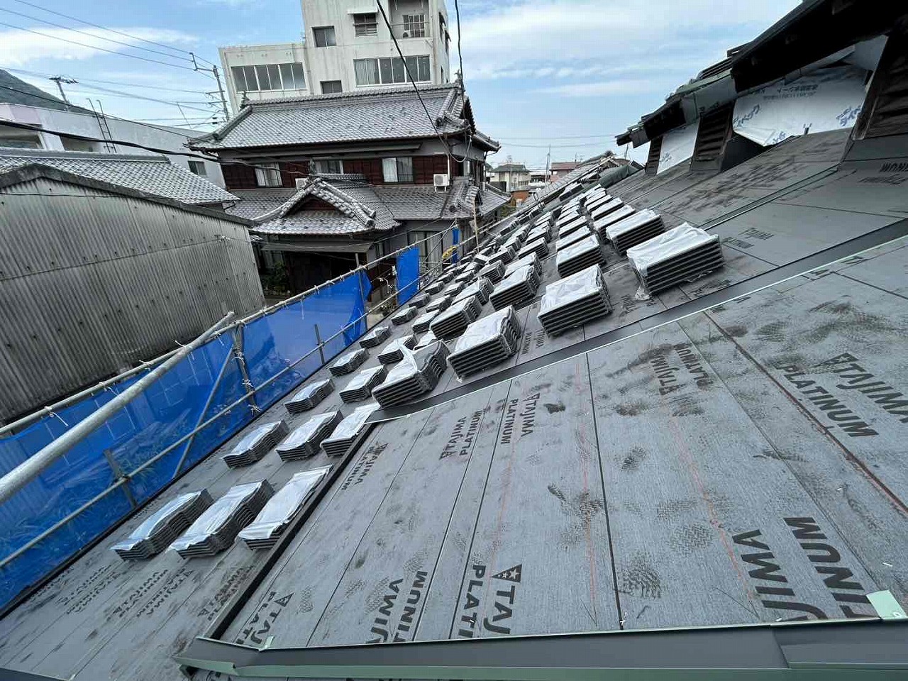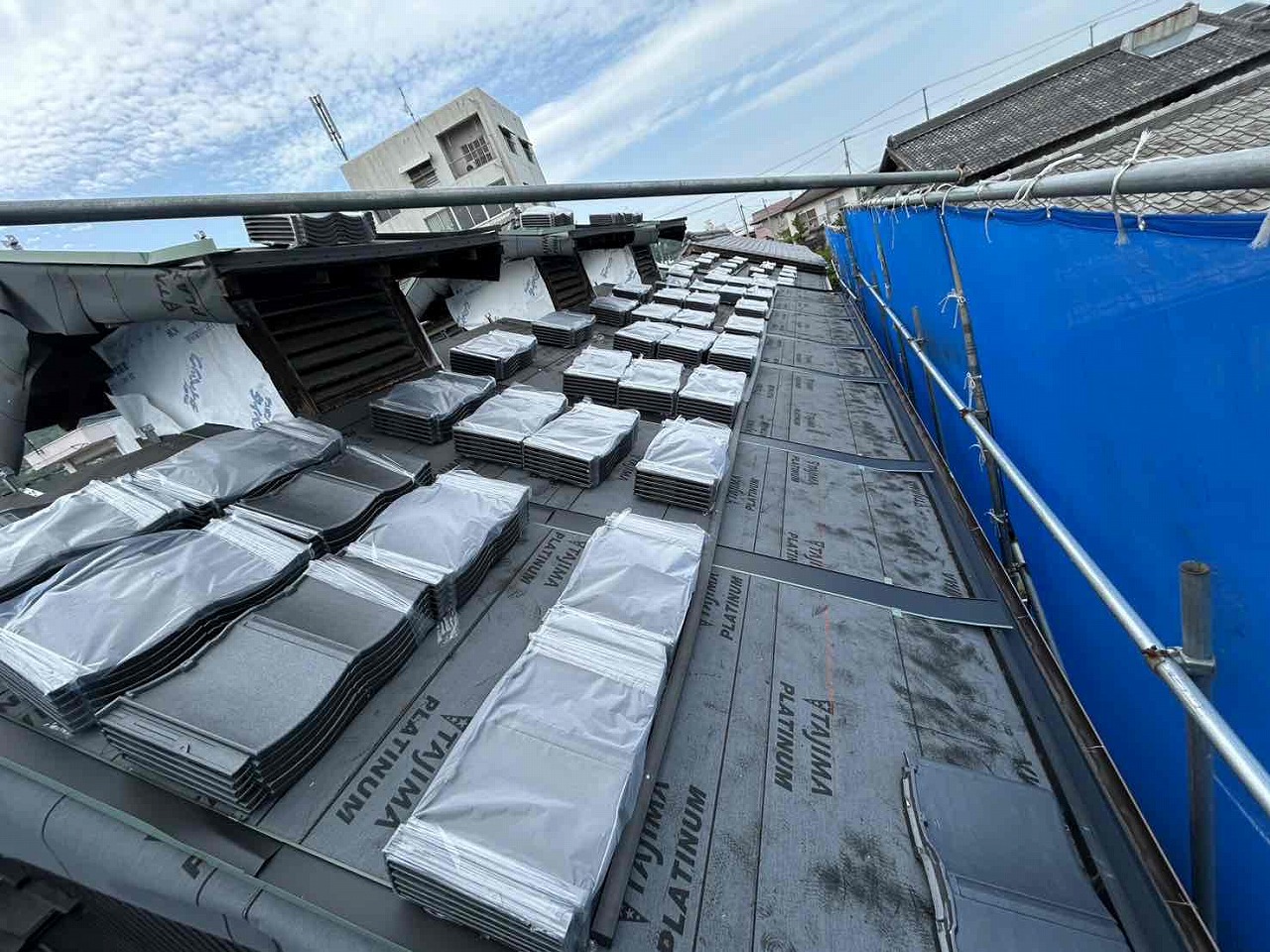 前回、板金工事が完了しており、本日はROOGA施工の前の瓦の配置工事を行いました。次回、ROOGAの施工を行っていく予定となっております。引き続きよろしくお願いいたします!😄