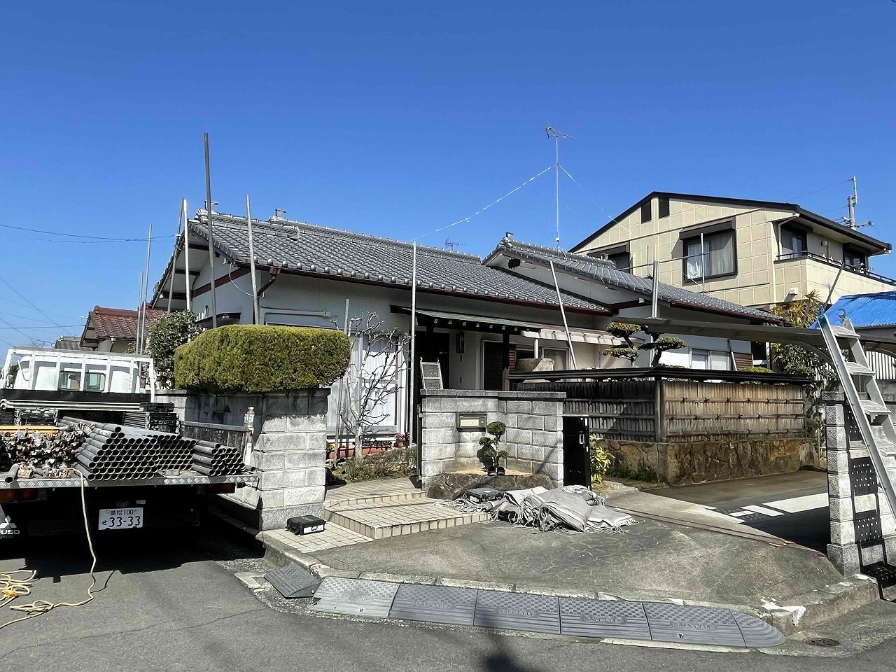 香川県高松市香南町西庄K様邸にて外壁塗装工事の足場を設置いたしました!