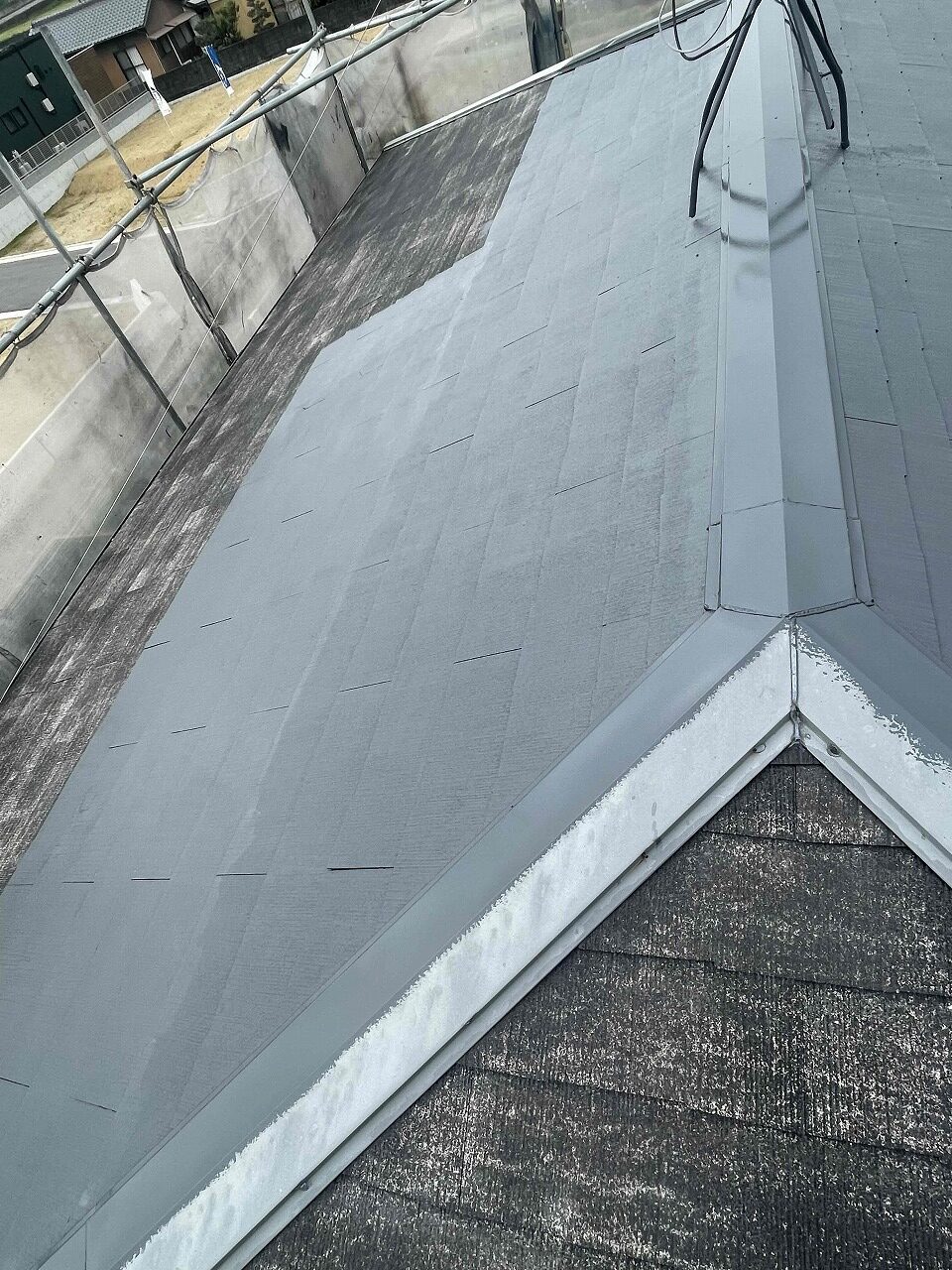 先日、屋根塗装工事の下塗り作業が終わっており、本日、中塗り(2回目塗り)塗装を行いました。