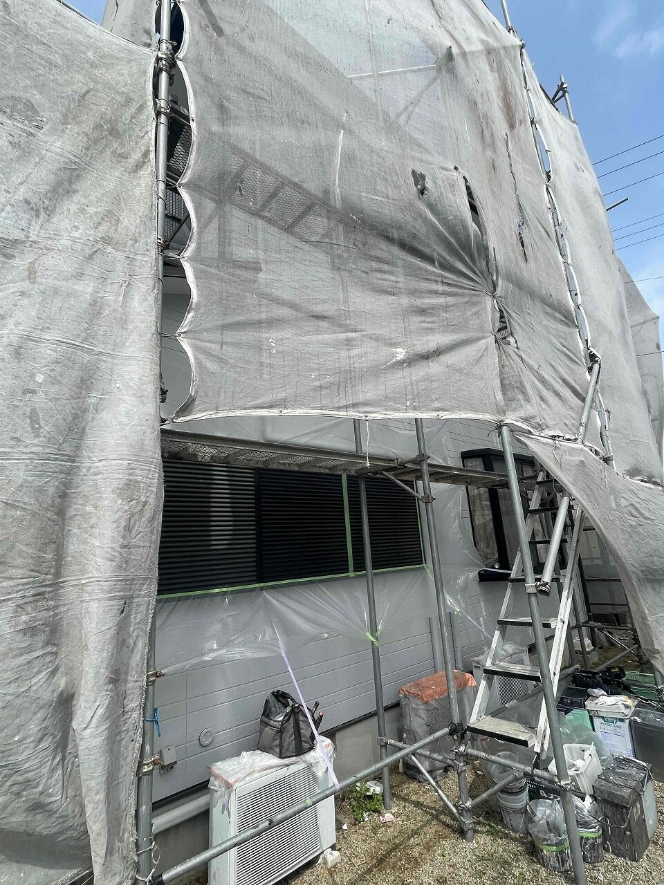 養生作業を行い、塗装する前の様子となっております。このあと、最終チェックと手直しを行い、すべての塗装工事が無事完工いたしました。施工事例は後日搭載いたします。
