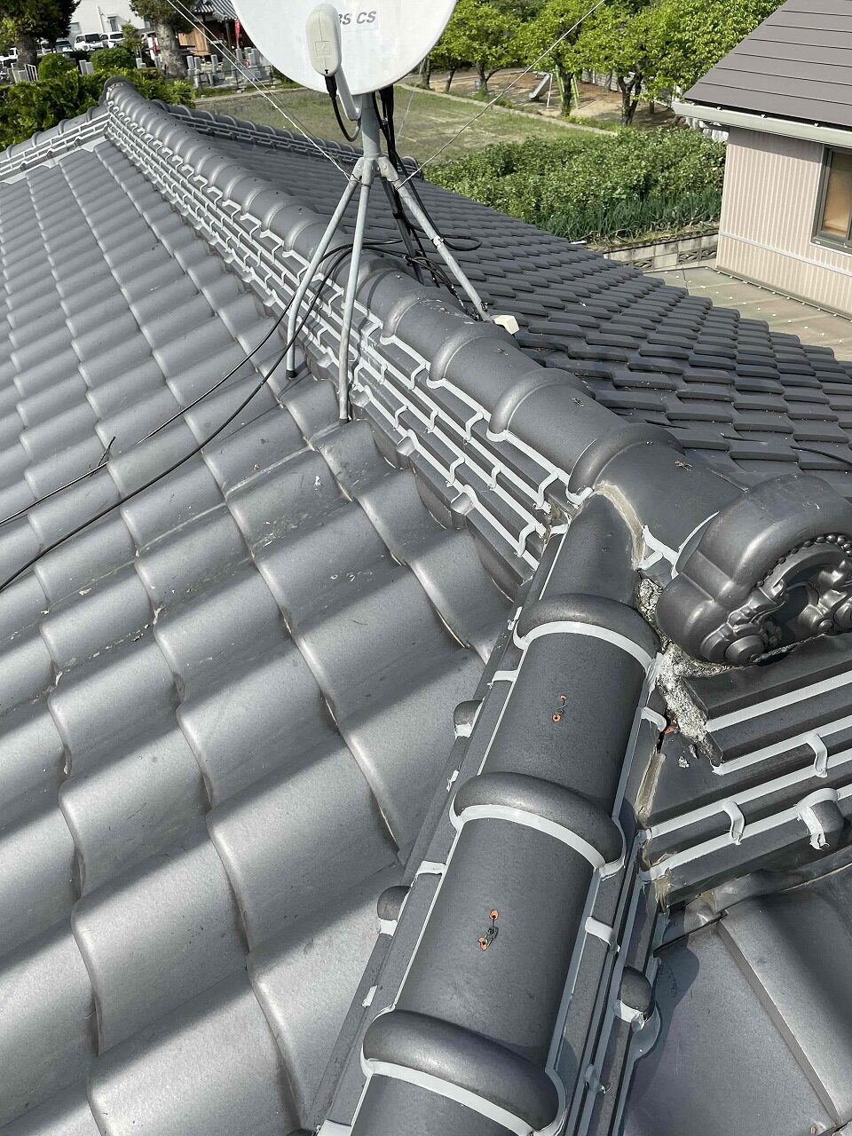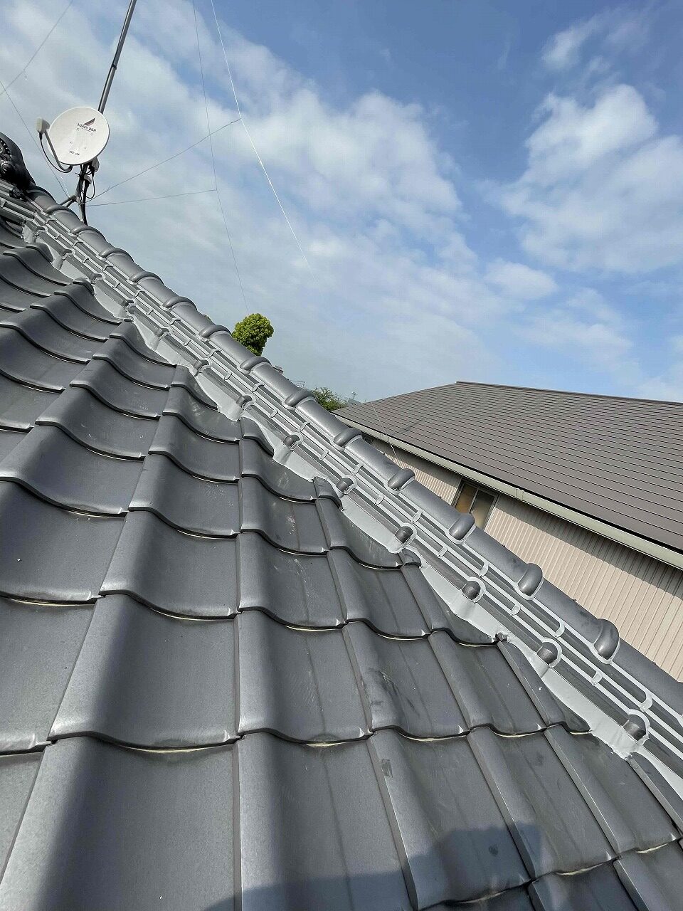 瓦の漆喰部分が経年劣化により、とれて中の土が見えていたところを、漆喰ではなくシリコンで補修いたしました!