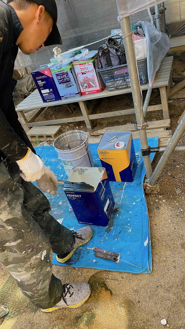 今回使用している塗料は日本ペイントパーフェクトトップとなります。本日、外壁塗装の3回塗りが完了し、明日より屋根塗装工事(日本ペイントファインパーフェクトベスト)と屋根カバー工法(ガルバリウム銅板)を順次行っていく予定となっております。