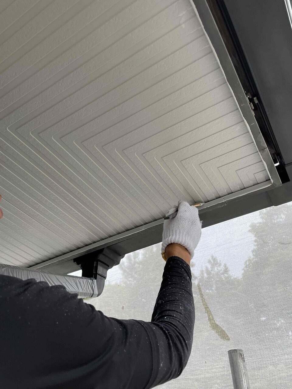 軒天塗装1回目が終わり、ローラーで濡れない場所をハケを使い丁寧に塗っていきました。そのあと2回目の塗装を行い、軒天と装が完工いたしました。