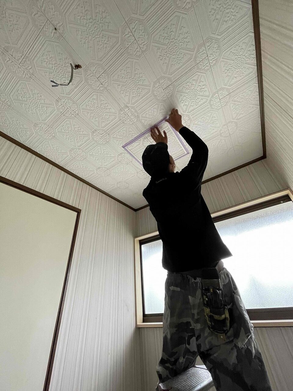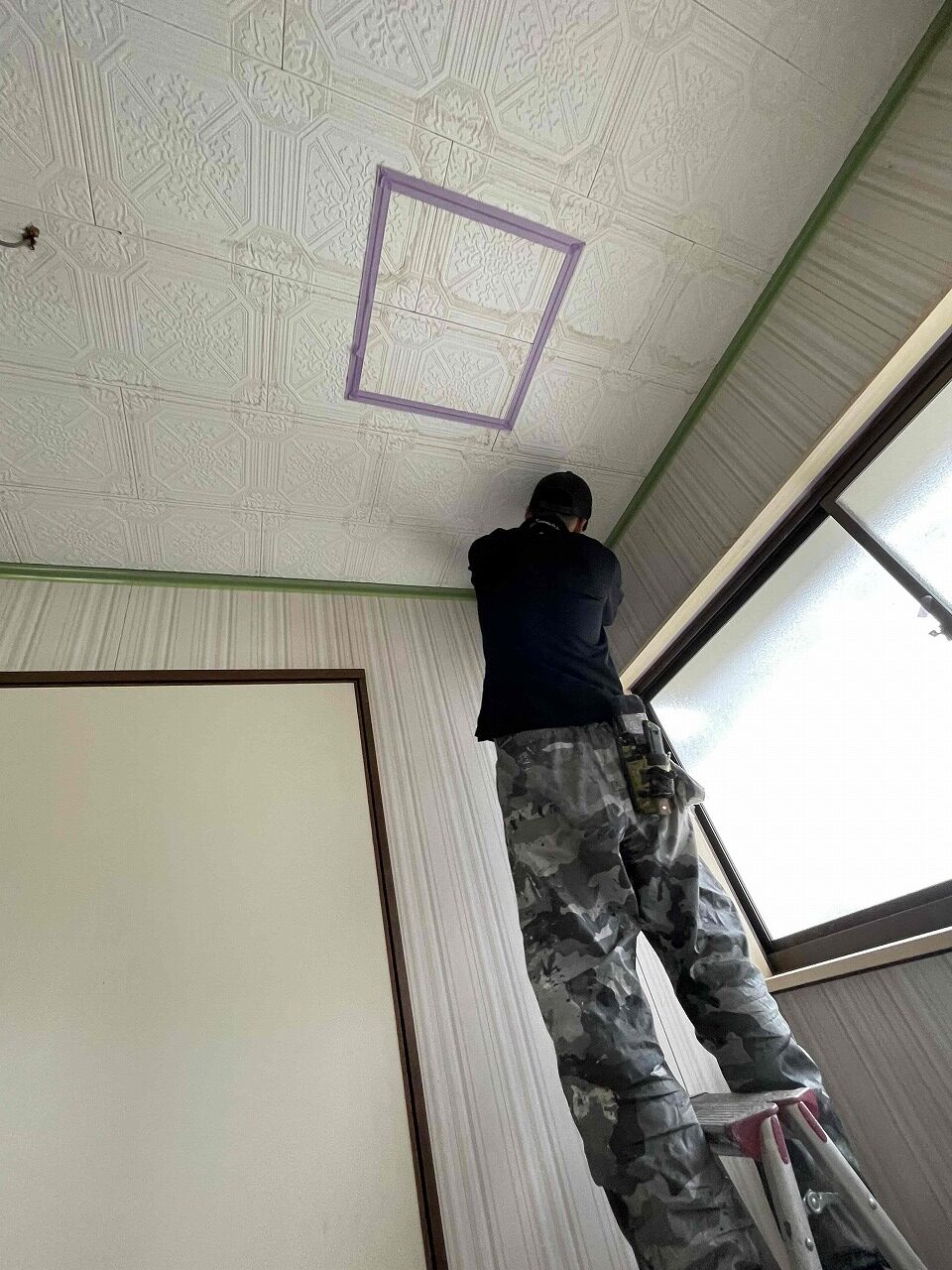 7月に大がかりな屋根塗装・外壁塗装を工事させていただくお客様のおうちにて、本日雨天のため室内の塗装工事を行いました!お写真は塗装する前の養生をしている様子となります。このあと、塗装工事を行い、お昼過ぎには工事が完了いたしました?