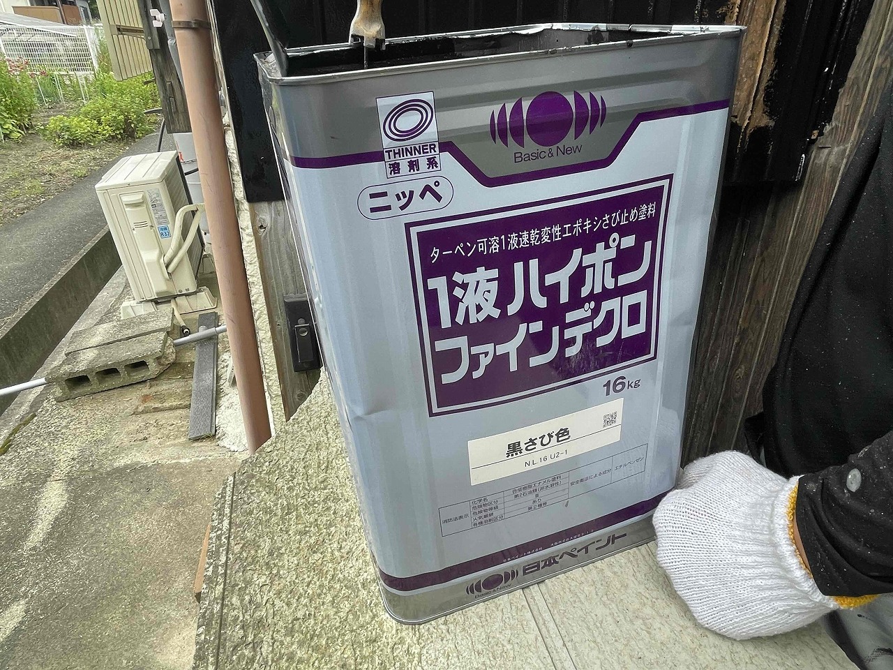 錆止めは日本ペイントのハイポンファインデクロで行いました。明日は台風による大雨の予報のためこの現場はお休みし、明後日より中塗り行っていく予定となっております。引き続きよろしくお願いいたします?
