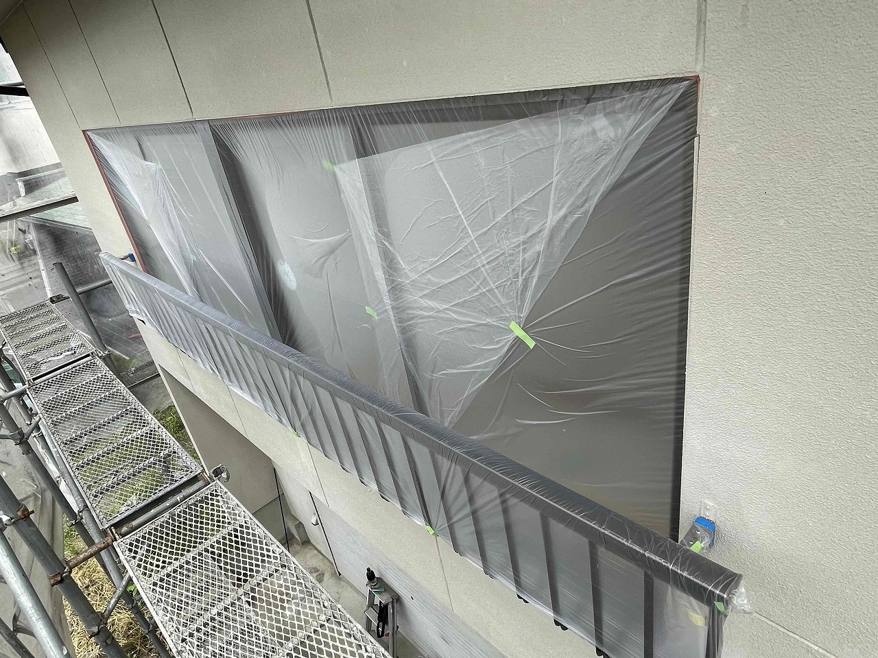 本日養生作業を行い、明日の午前中に外壁のクラック(割れ)補修を、午後より下塗り(1回目塗装)を行っていく予定となっております。