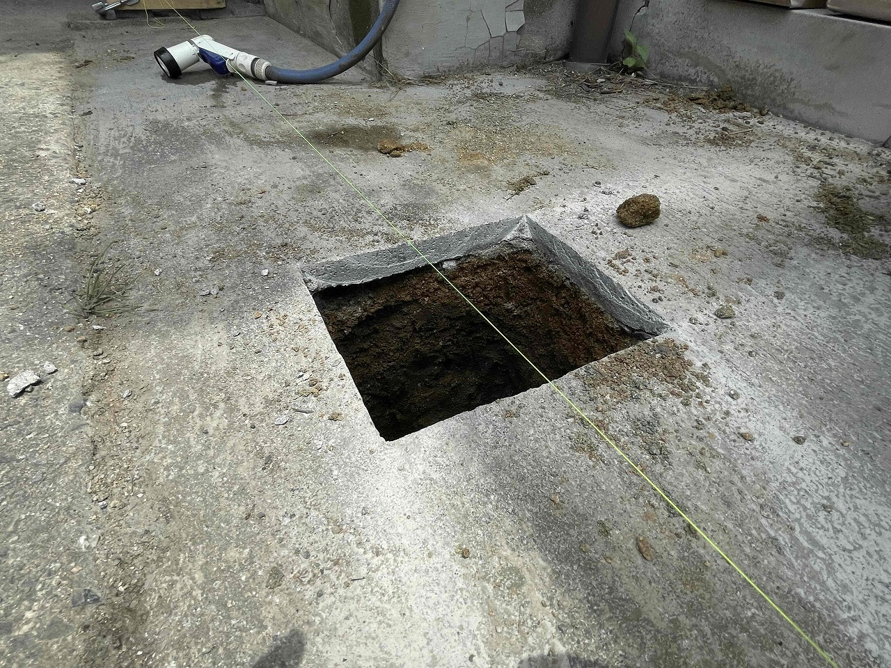 柱を立てる位置をサンダーで切り取り、スコップで土を掘り、地面を整えて柱を立てました。