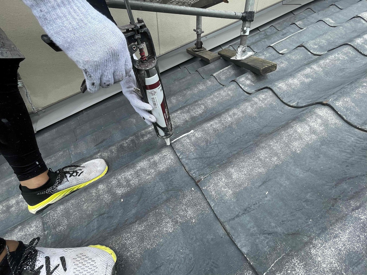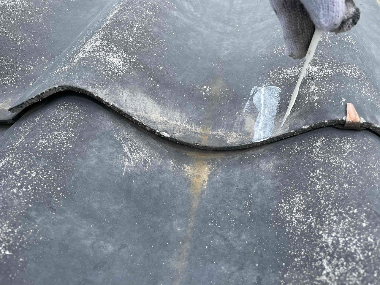 瓦の表面が数十箇所クラックが入っていたため、専用の補修材で補強していきました。