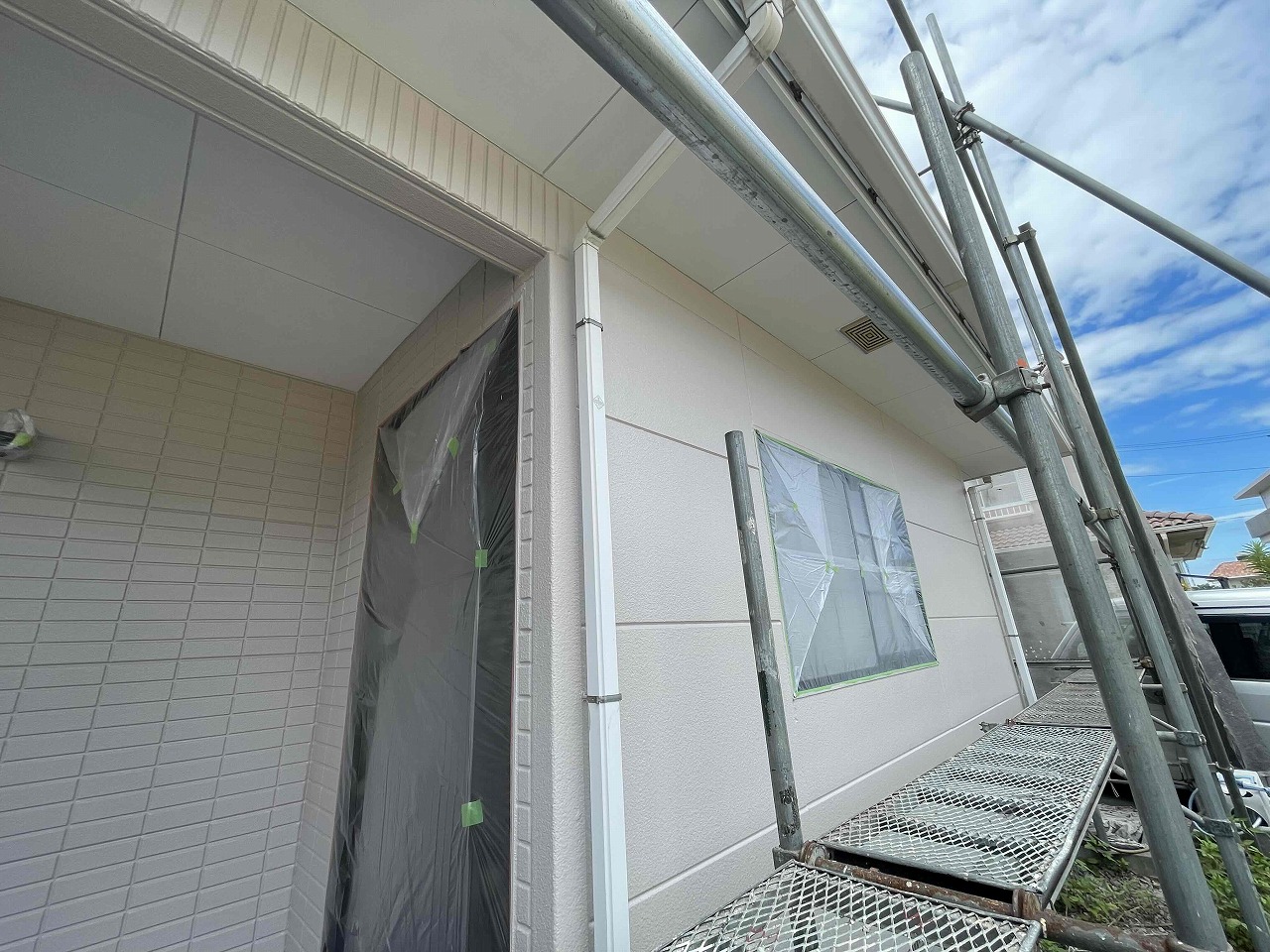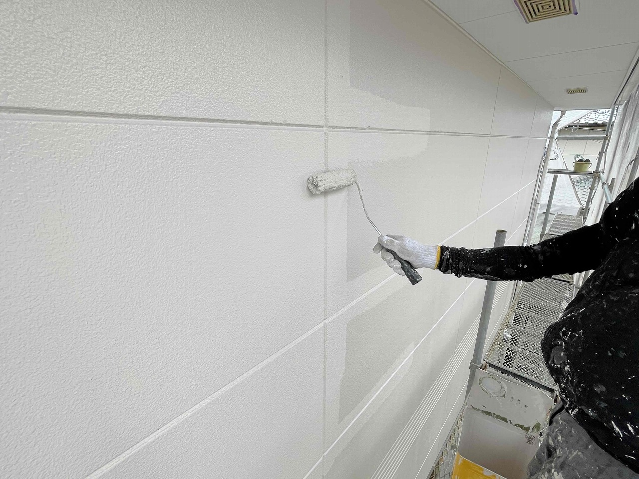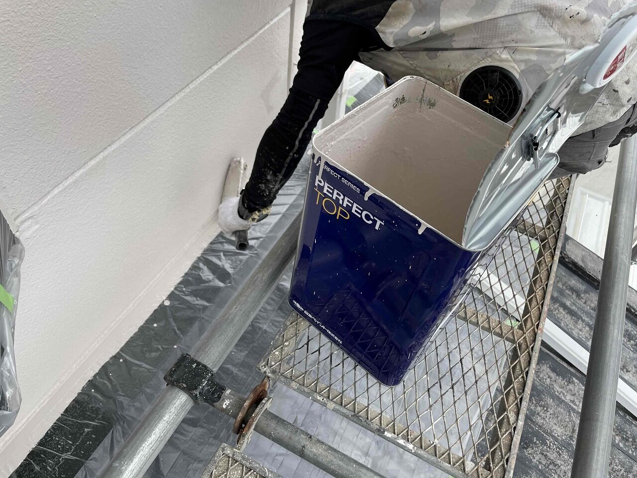 本日、外壁塗装の3回塗り(日本ペイントファインパーフェクトトップ)が完工し、次回より付帯パーツ(雨樋や木部など)を塗装していく予定となっております。