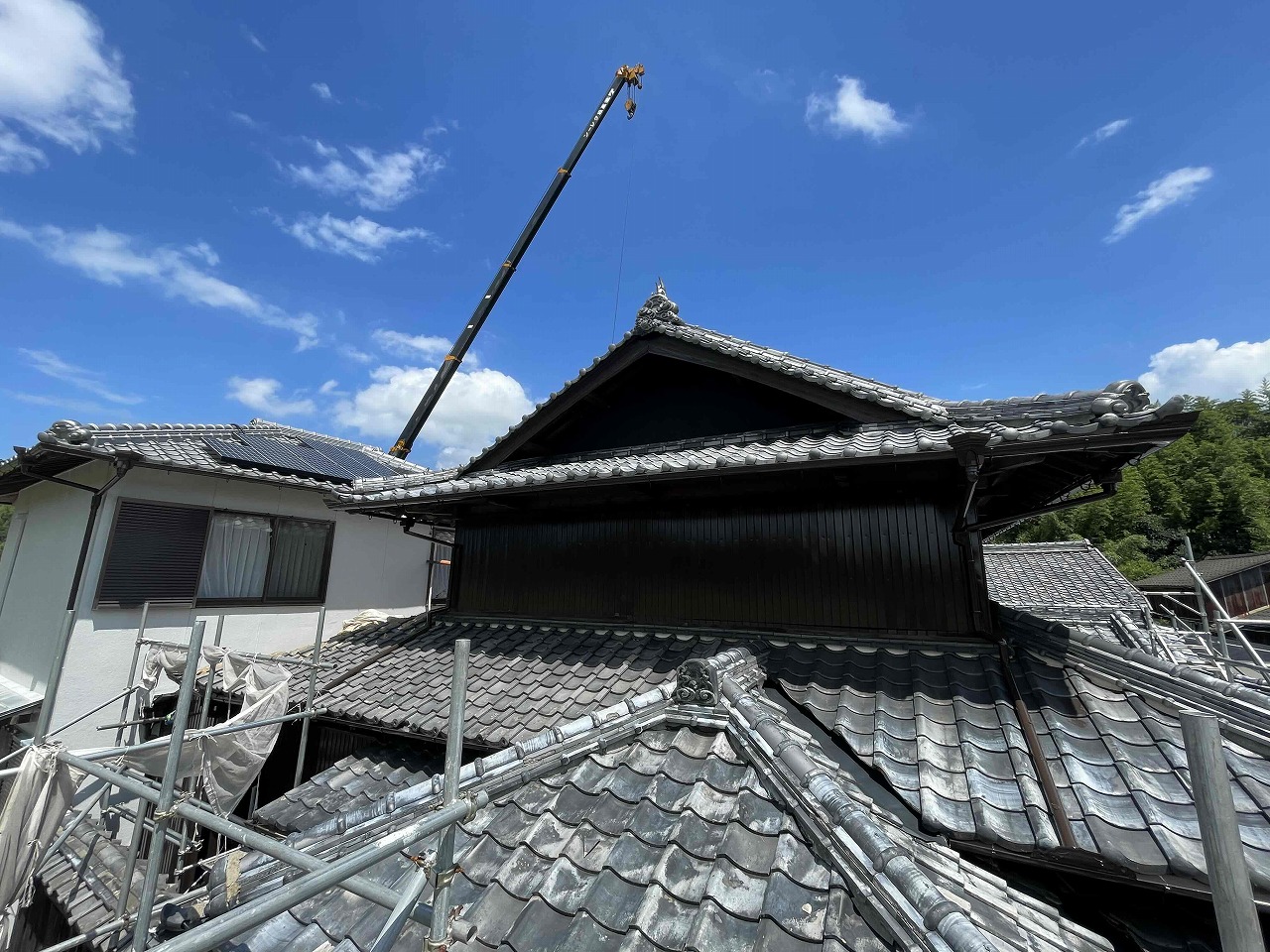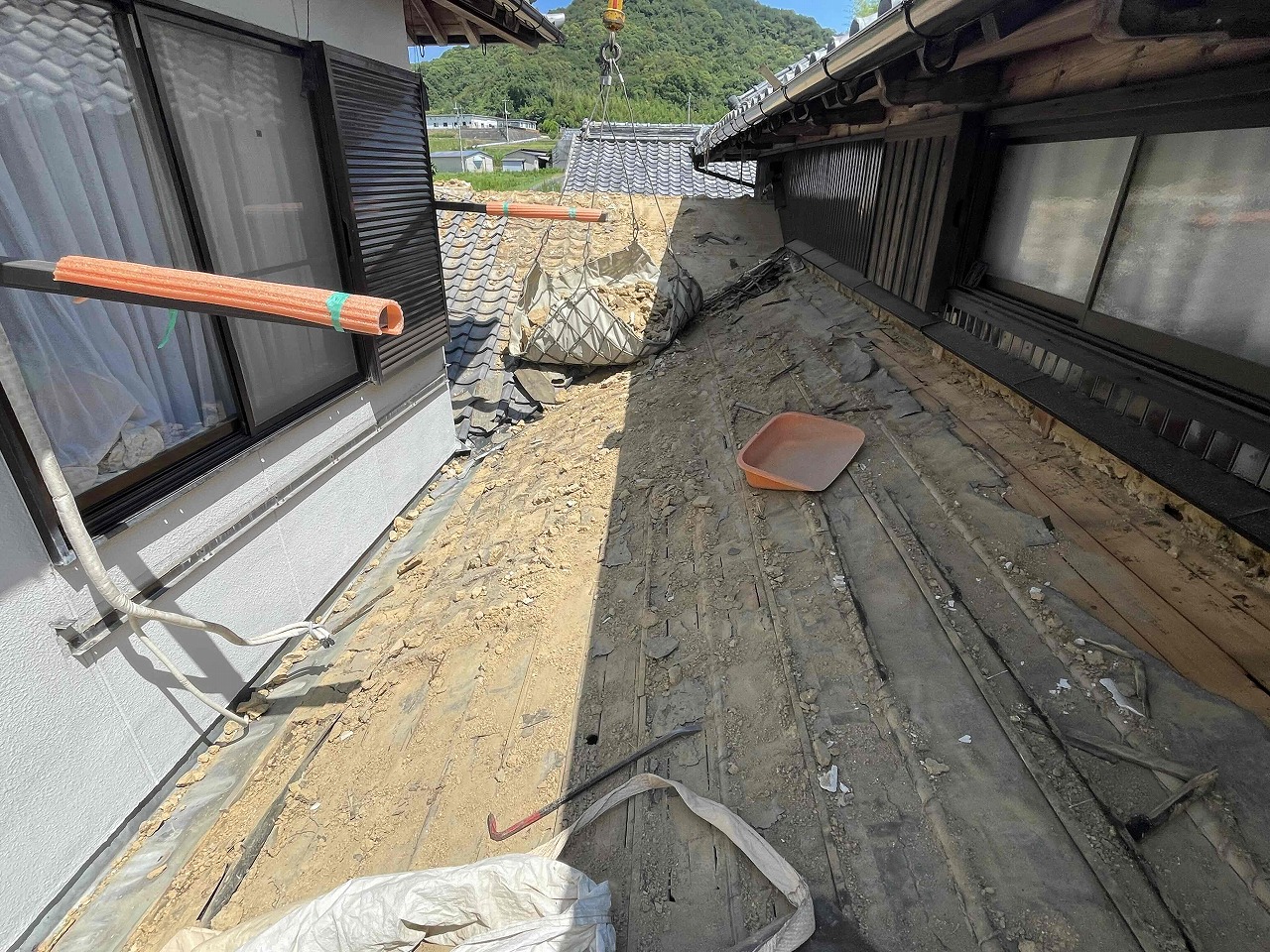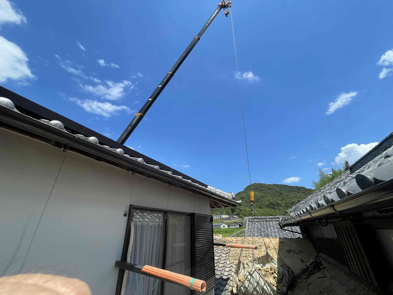 先日、外壁塗装工事が完工しているお家の屋根の葺き替え工事(瓦交換)を着工いたしました!既存の瓦を撤去し、狭い箇所だったのでクレーンを使い、つり上げて下ろしていきました。本日、撤去作業が完了し、明日より下地作業を行っていく予定となっております。今回、使用する瓦の種類はケイミューROOGA雅となっております。引き続きよろしくお願いいたします!?