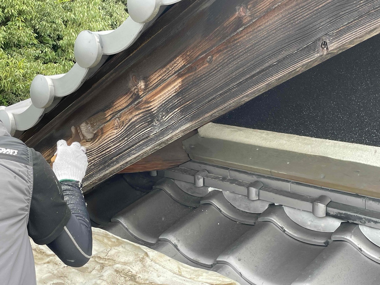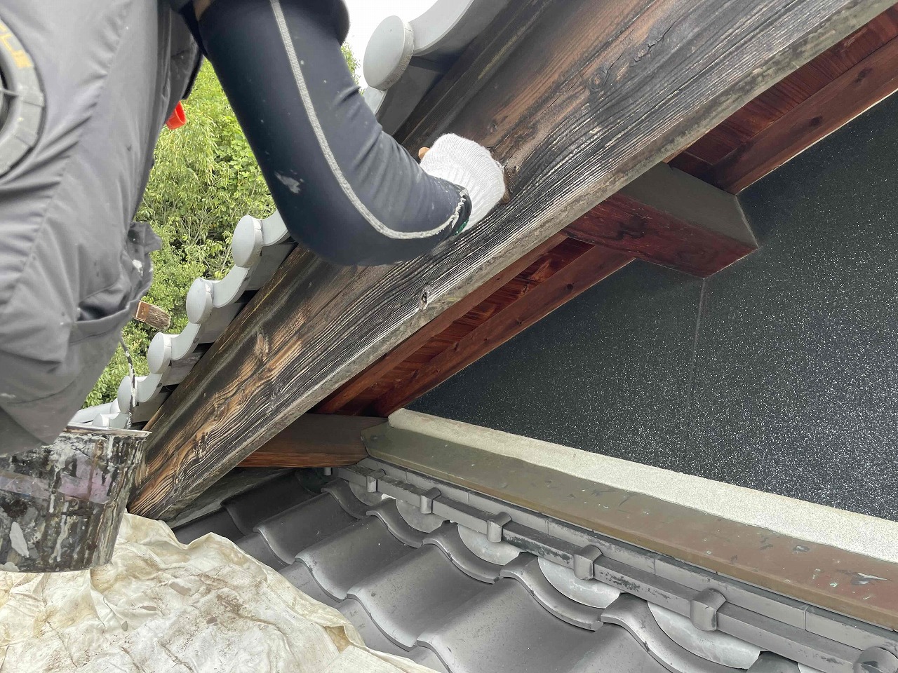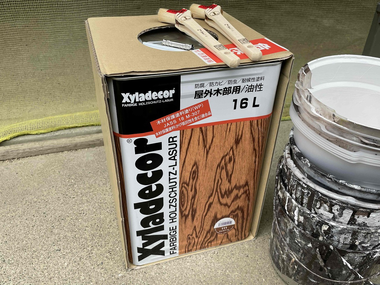 本日、破風板の塗装を行いました。使用した塗料はキシラデコール(防腐剤)です。