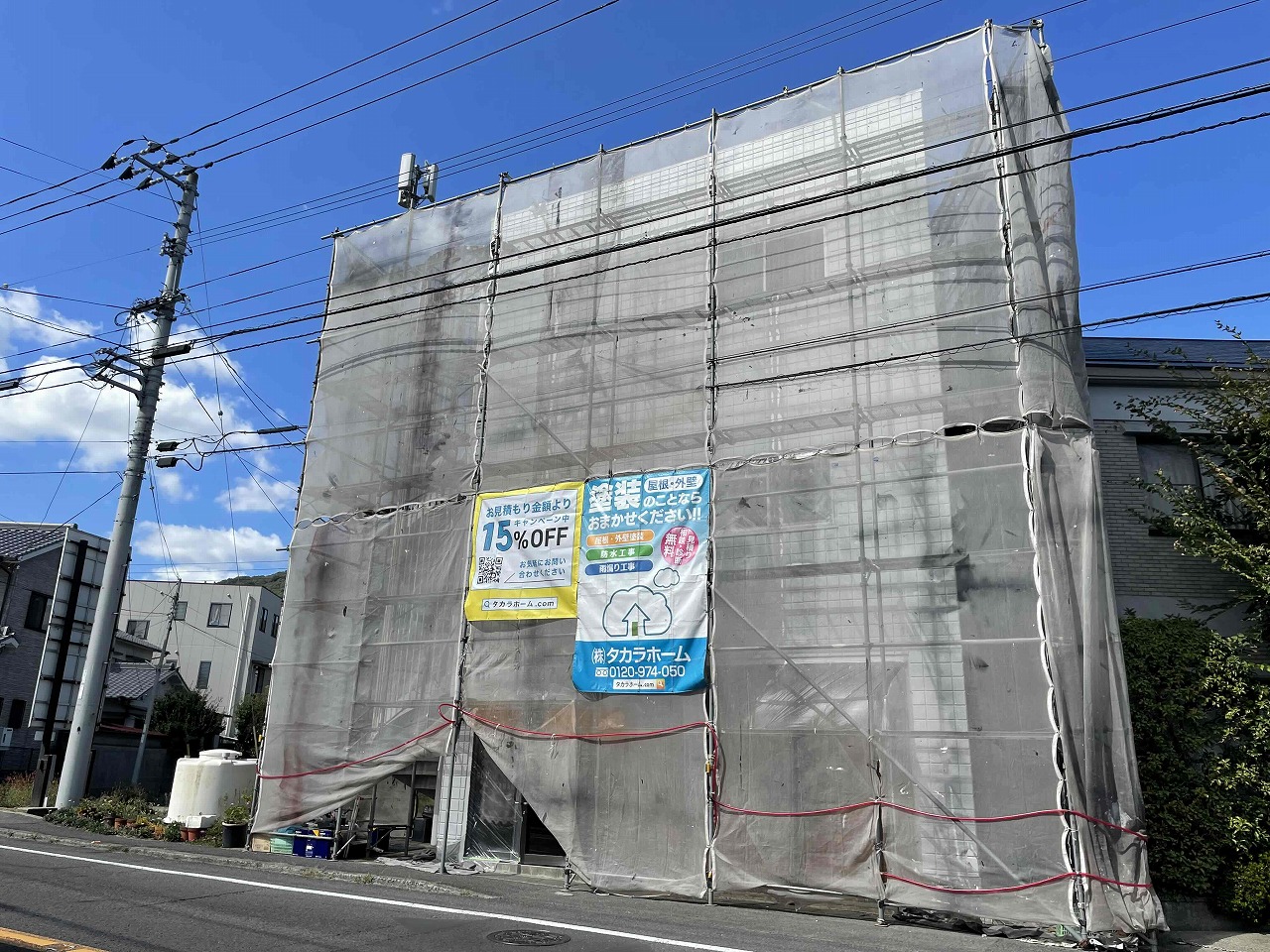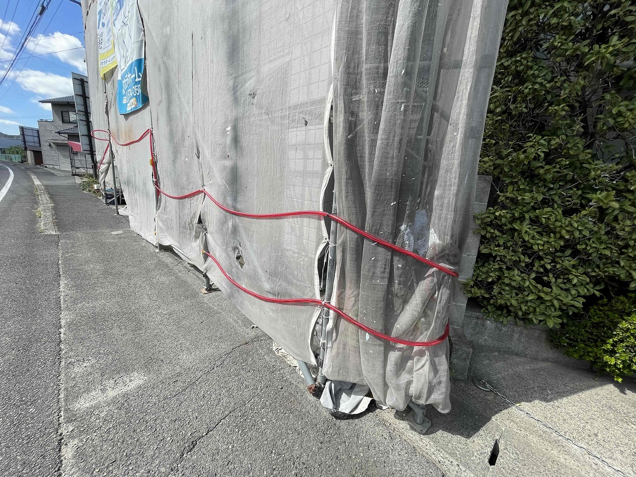 こちらの現場は県道に面しており、足場が歩道に出る部分に関しては警察署や土木事務所で道路許可をとっております。