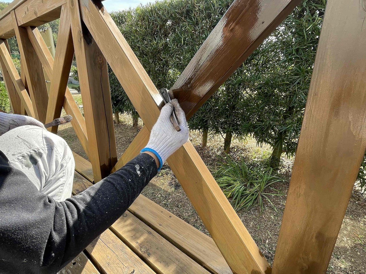 先日に引き続き、お家周りの木部を防腐剤(キシラデコール)で丁寧に塗装していきました!