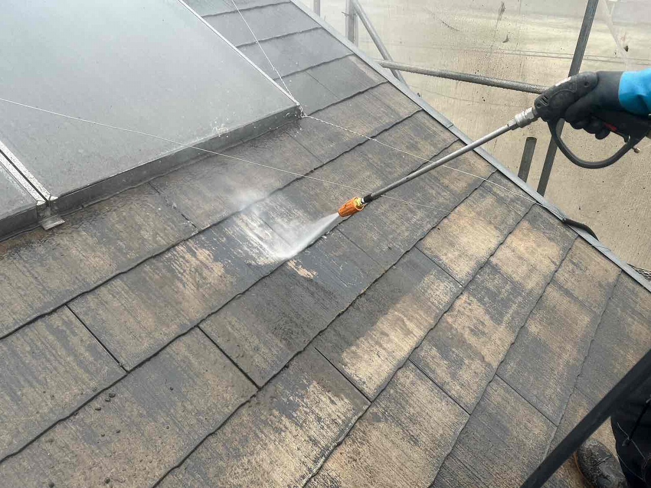 屋根・外壁塗装工事を行う前に高圧洗浄を行い、古い塗膜やコケなどを綺麗にお掃除していきます。