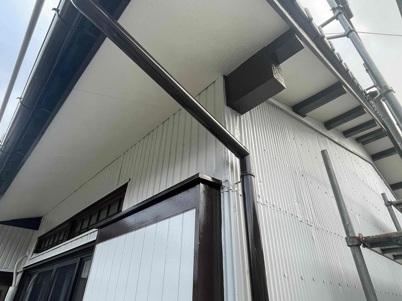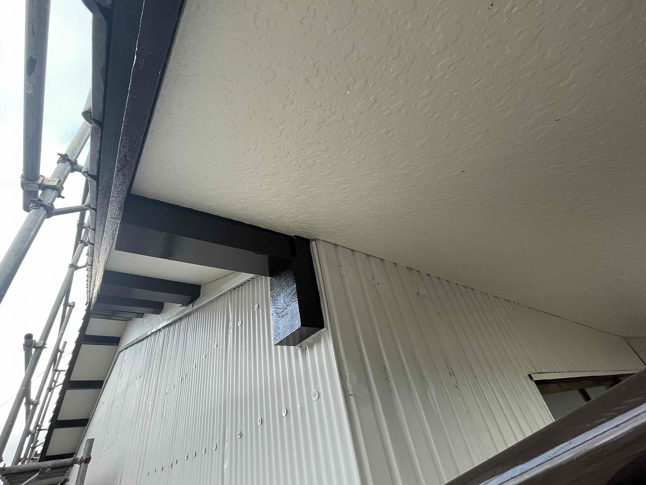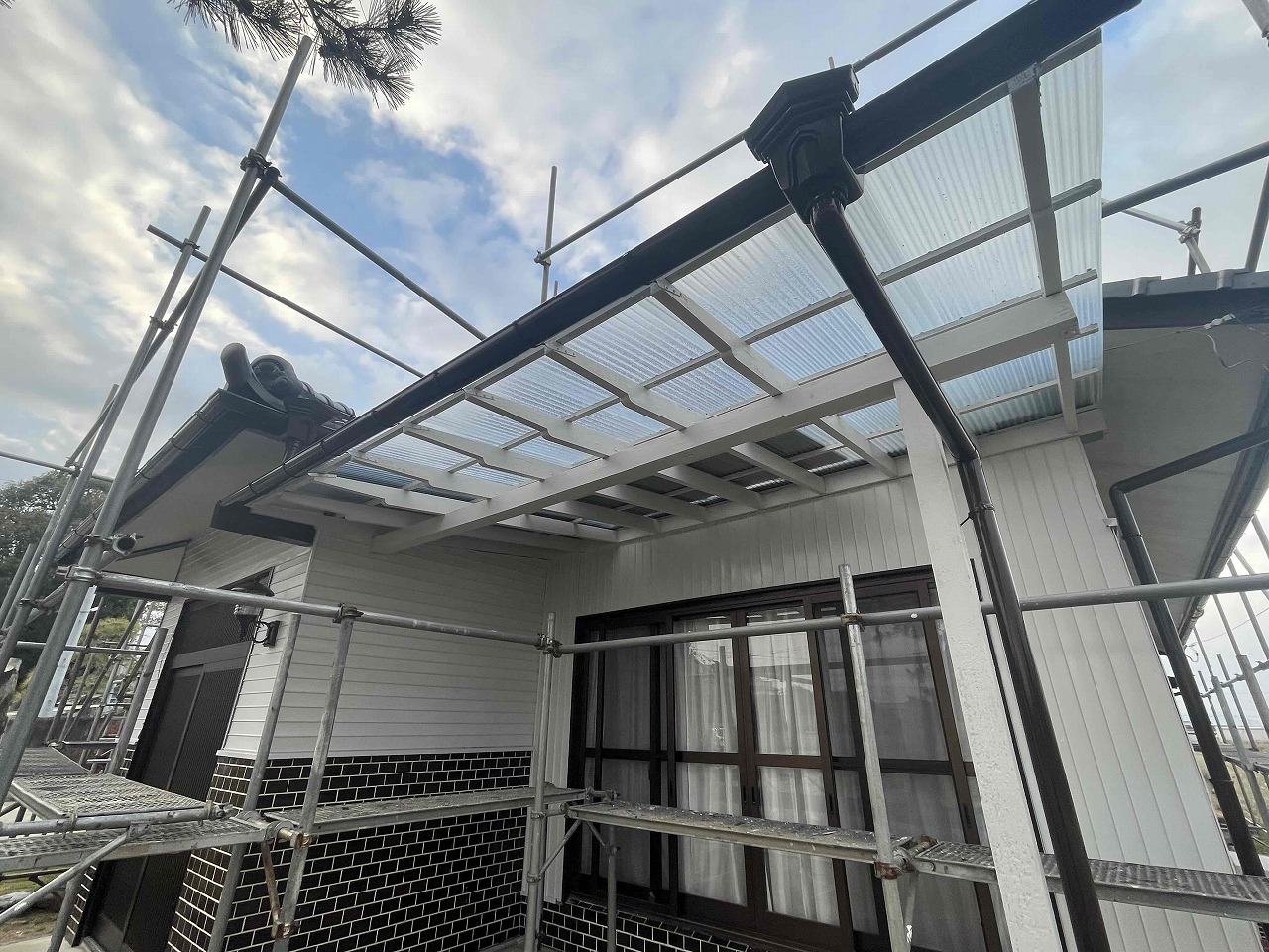 先日、外壁塗装工事が完工しており、本日は軒天と波板工事を行いました。
