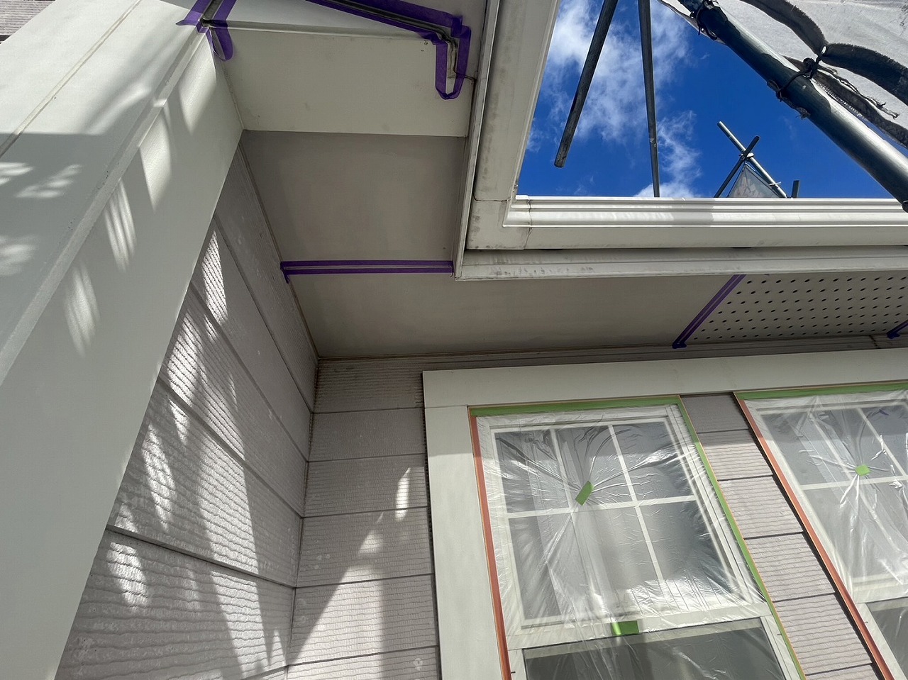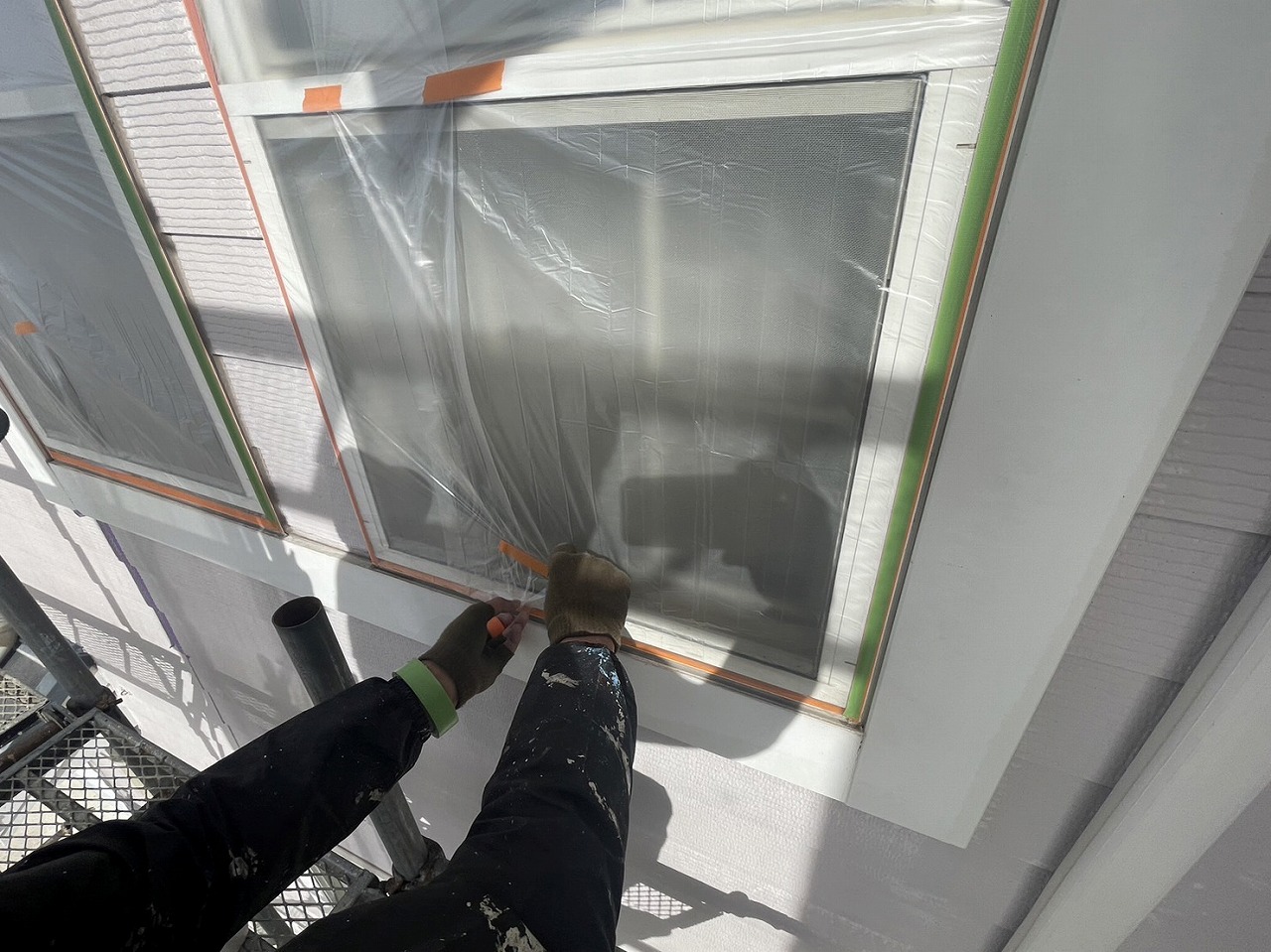 養生作業が本日完了し、その後、古くなったコーキングの撤去を行いました。明日もコーキング工事の続きを行っていく予定となっております。引き続きよろしくお願いいたします!?