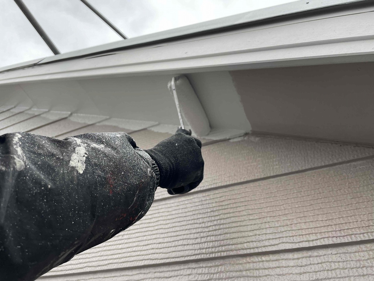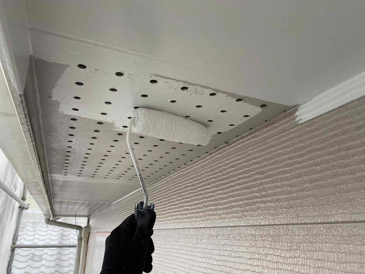 本日、軒天塗装工事を行いました。明日は天気予報が雨のため、現場をあけさせていただく予定となっております。引き続きよろしくお願いいたします!?