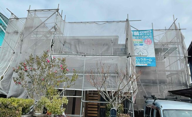 香川県綾川郡綾川町陶K様邸にて外壁塗装工事の足場設置が完了いたしました!