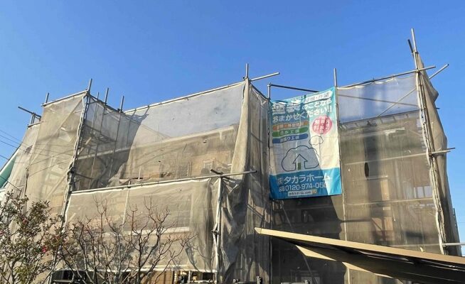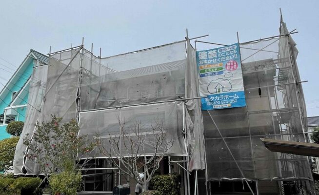 香川県高松市香南町西庄O様邸にて屋根外壁塗装工事の足場の設置が完了いたしました!