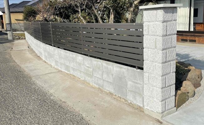 ご相談 ブロック塀に多数亀裂が入っており、道路側に倒れかけていた。 地面が土で、雨の時に泥まみれになっていた。工事内容 1.ブロック塀の解体 2.排水の工事 3.土の掘り起こし 4.ブロック3段積む 5.カーポートの柱を立てる 6.土間打ち 7.アプローチの石を置く 8.アルミフェンスとカーポートの屋根の取付