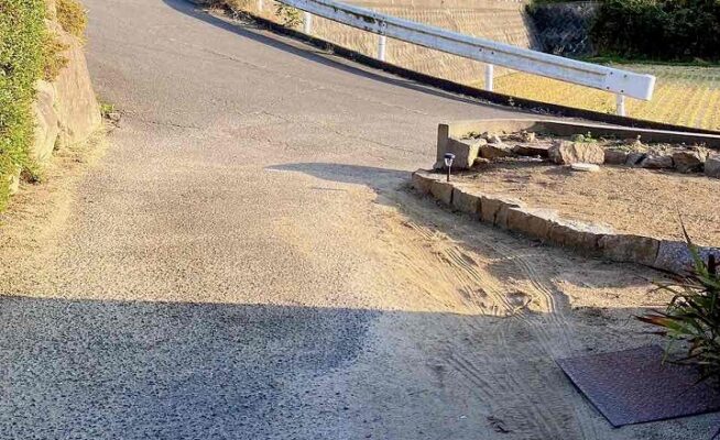 ご相談 車の出入りがしづらいため、道幅を広くしたい。工事内容 1.切り株撤去 2.石移動 3.完工