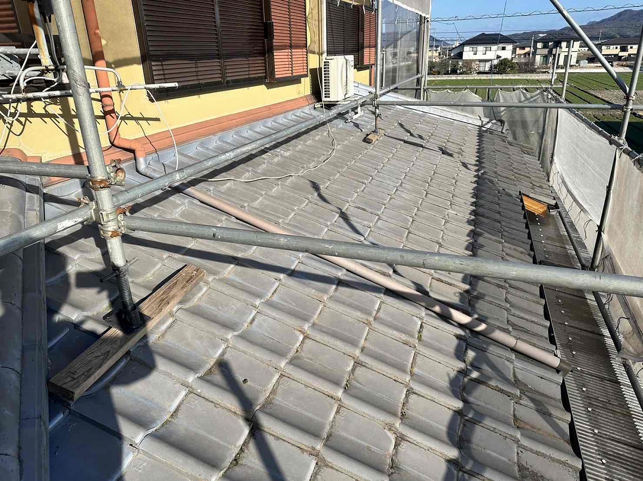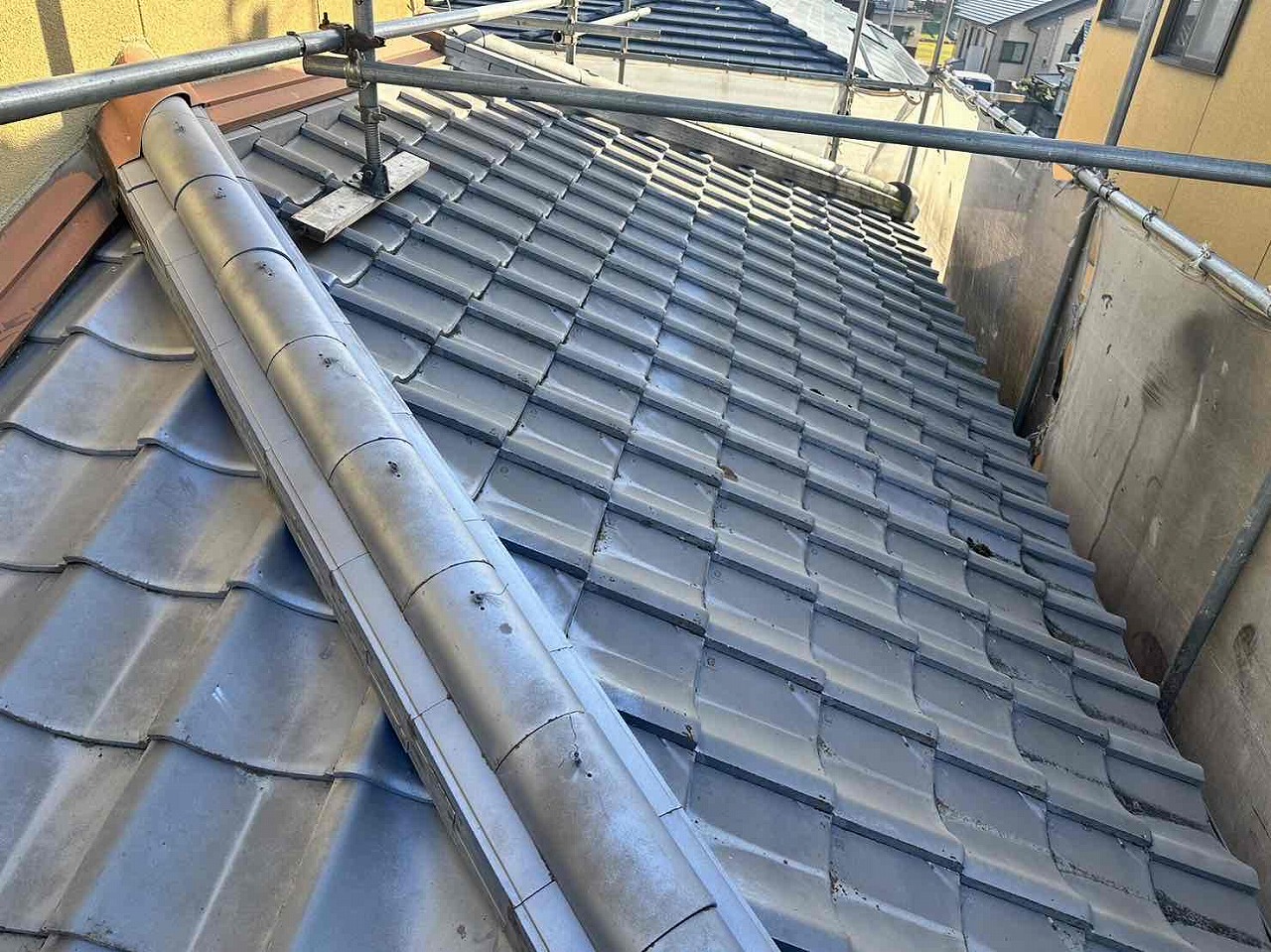 1.足場設置 2.高圧洗浄 3.下地調整(クラック補修) 4.屋根塗装(3回塗り) 5.足場解体 6.完工