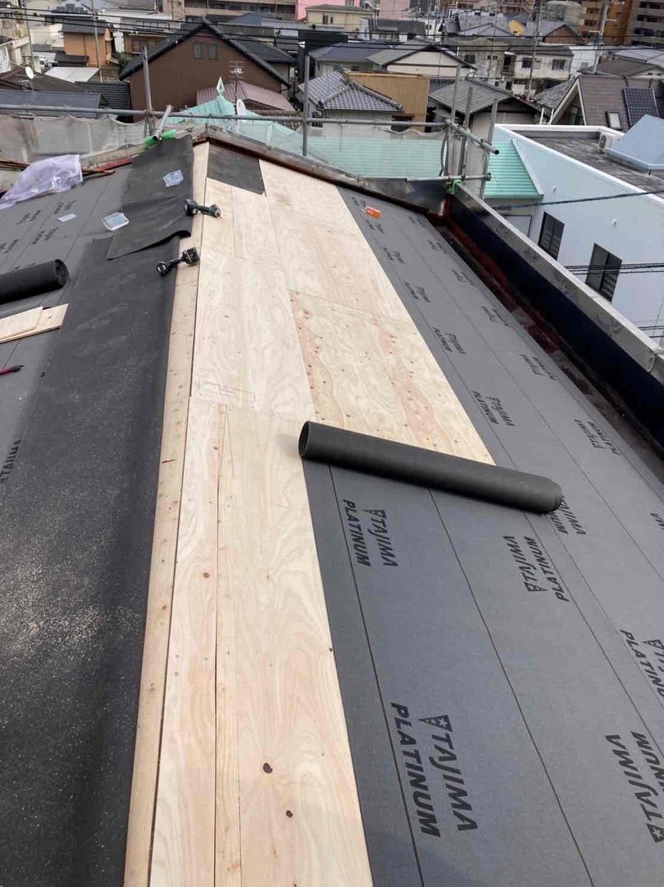 1.足場設置 2.瓦撤去 3.コンパネ 4.防水シート 5.瓦貼り付け 6.完工
